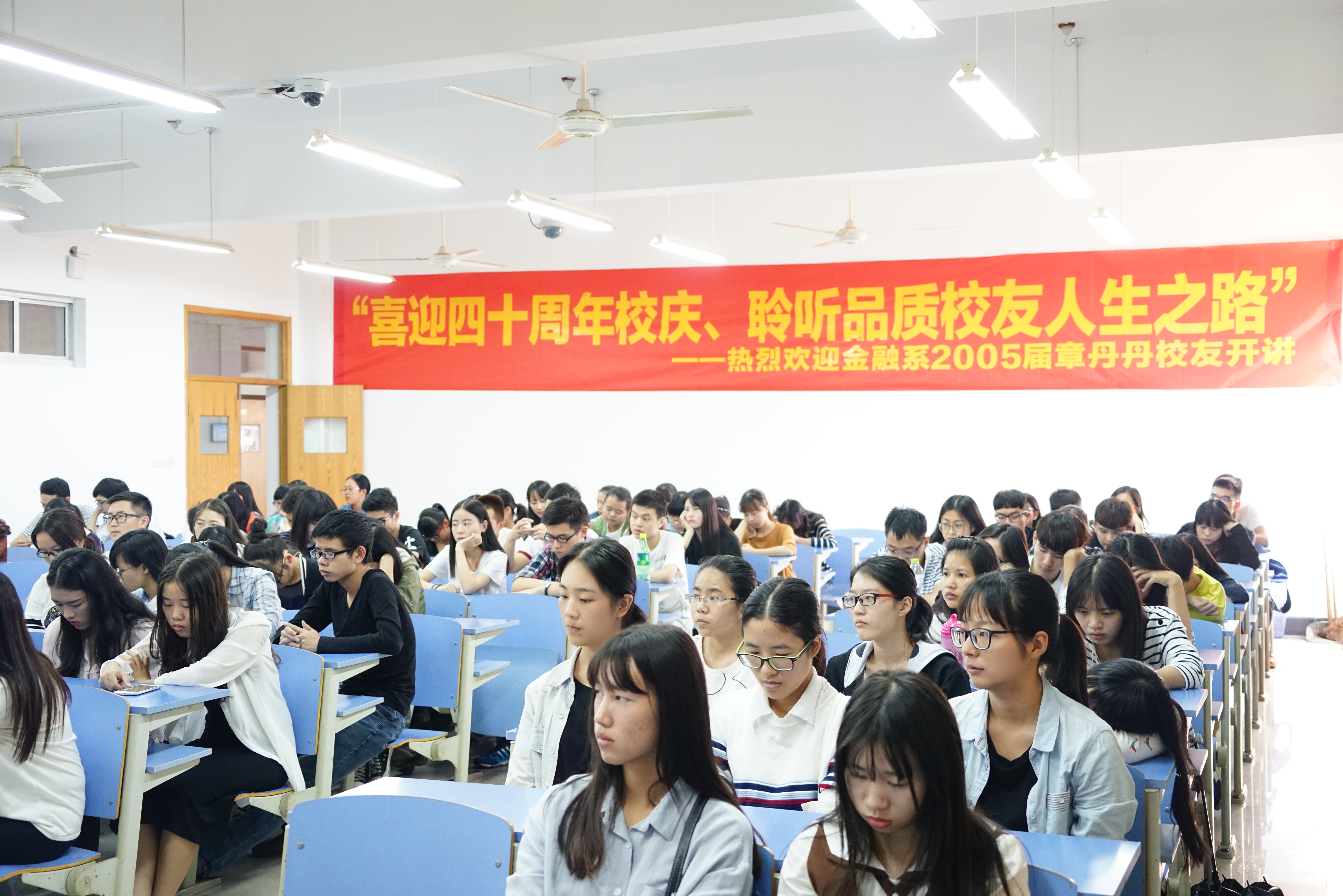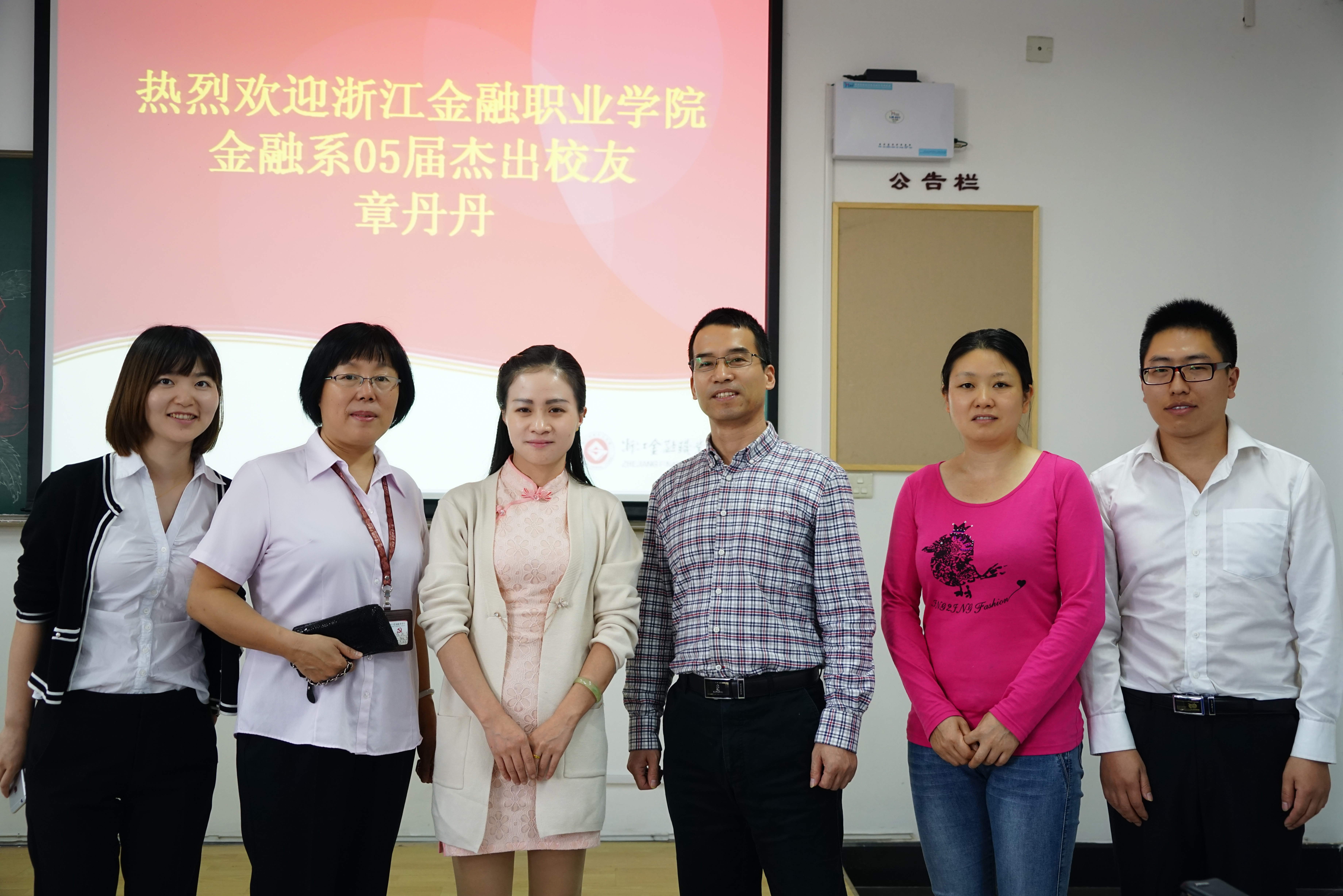 近日,为迎接浙金院四十周年校庆的到来,金融系举办了一系列迎校庆校友话人生讲座活动。金融系于10月21日在8207举行喜迎浙金院四十周年校庆系列活动之四——金融系05届杰出校友章丹丹校友话人生讲座。出席讲座的领导有金融系党总支书记熊秀兰,党总支副书记钱利安,系办主任王娟、以及金融系辅导员苏浩、蓝丹丹,活动由苏浩主持。