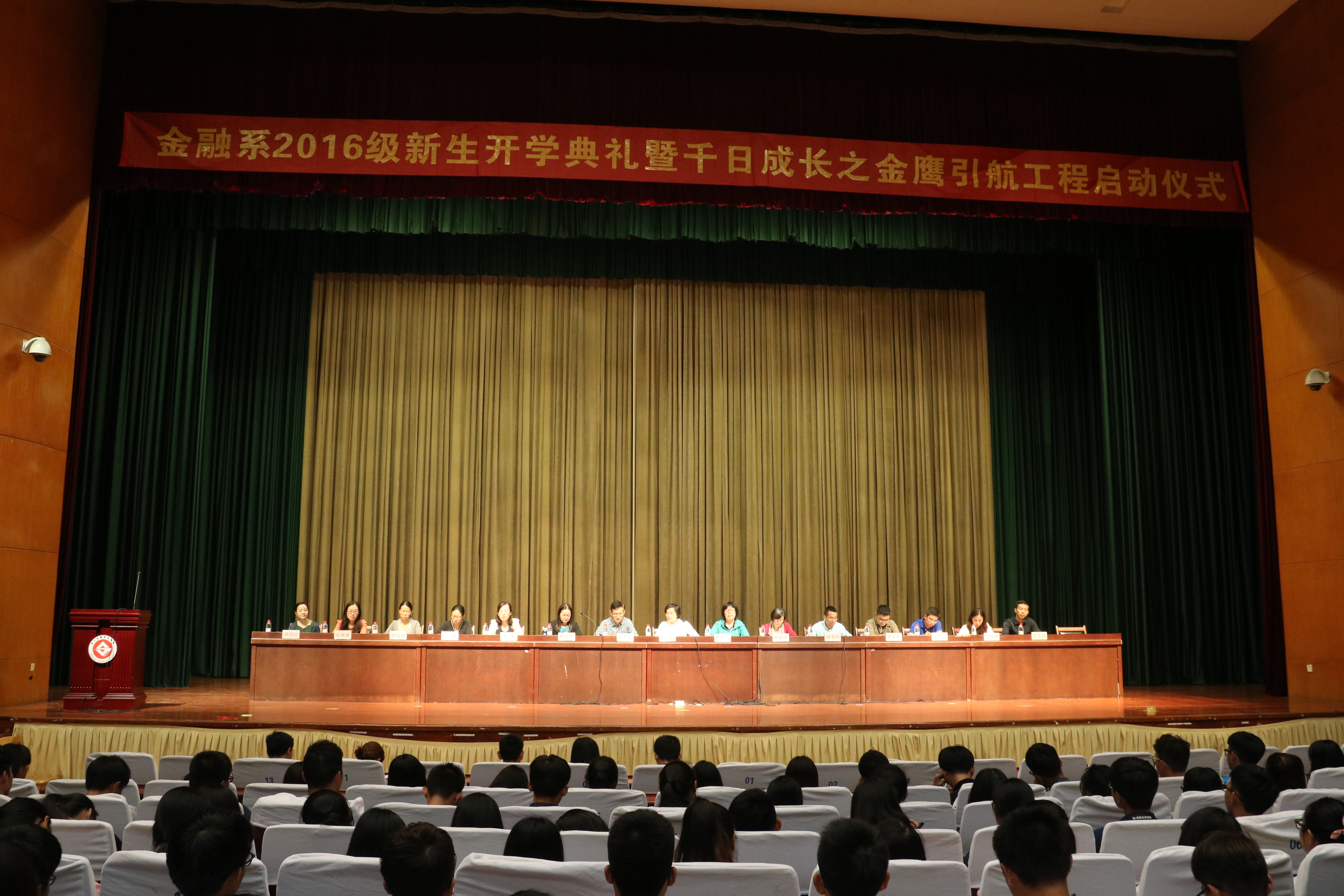 10月9日,金融系2016级新生开学典礼暨千日成长工程之金鹰引航工程启动仪式在金葵花艺术中心隆重举行。出席开学典礼的领导有学院副院长吴胜,金融系主任赵国忻,系党总支书记熊秀兰,学院合作发展处处长(农村合作金融专业主任)郁国培,系副主任董瑞丽,系党总支副书记钱利安,金融系各个教研室主任及副主任,辅导员及2016级新生班主任,典礼由钱利安主持。