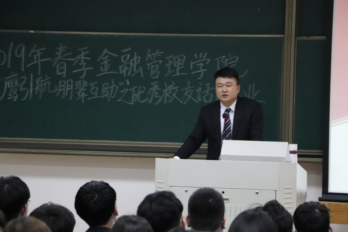 为了给17级同学们提供订单招聘面试的指导,金融管理学院举行了“金鹰引航朋辈互助”之校友话就业的活动。金融管理学院于3月27日有幸邀请到来自台州银行江东支行的客户经理、农金103班优秀校友方科为同学们提供银行就业的指导。出席本次讲座的有农金171、172、173全体同学,本次讲座的主持人为王德英,由校友方科主讲。