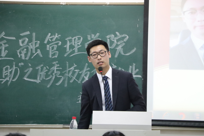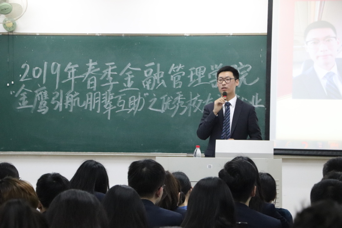 为搭建在校生与优秀校友交流和学习的桥梁,让在校生认清当前就业形势,再往后的职业生涯中能够脱颖而出,也让优秀校友对在校生未来的人生道路提出建议。金融管理学院于3月27日下午邀请到长兴联合村镇银行业务转型主管、金融091班优秀校友卢彬,在八号楼8101教室举行了金融管理学院优秀校友话就业的讲座。参加本次讲座的有金融171、172班全体同学。本次讲座由朱维巍主持,由校友卢彬主讲。