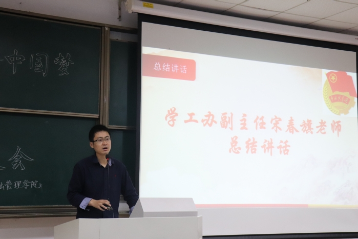 最后,由金融管理学院团总支书记宋春旗做总结讲话。宋春旗老师首先对前面发表演讲的青年代表表示了认同和赞许,接着强调了主题团日活动的庄严性,并要求了在今后主题团日活动中需要做到的标准:一、政治功能必须摆在活动的首位,在活动的主题设题上、在组织形式等方面要紧扣政治功能要求,强化政治引领和思想教育工程;二、要根据团学规定和群众的需求设置鲜明的主题;三、要制定详细计划,团支部要结合实际情况制定主题团日活动并上报审批;四、要固化活动时间;五、规范场所设置;六、严格规范程序;七、全体成员均得覆盖;八、注重活动成效。宋春旗希望全体团干部可以做到上述标准,让主题团日活动成为开展组织教育培养团员意识的重要载体,成为团员青年在实践中加强理论实施的重要途径,成为加强团的基本组织建设的重要抓手。