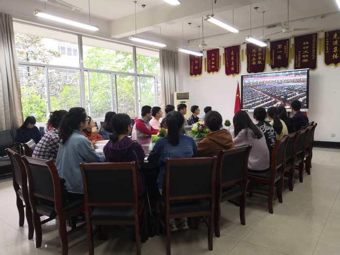 首先,由团总支书记宋春旗带领全体与会人员唱国歌,歌声激昂,令人振奋。随后,全体成员共同观看习近平总书记在纪念五四运动一百周年大会上的讲话。观看过程中,团干部们细心聆听,用心领会,并用纸笔进行摘录。