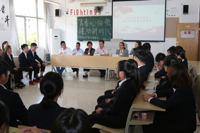 为了纪念五四运动100周年,展现当代大学生青春风采,金融管理学院金融182班于5月21日下午,在8206教室举行了以“青春心向党,建功新时代”为主题的班级团日活动。出席本次活动有浙江金融职业学院副校长郭福春,学院领导、教师代表和来自北京财贸职业学院的交流生们。