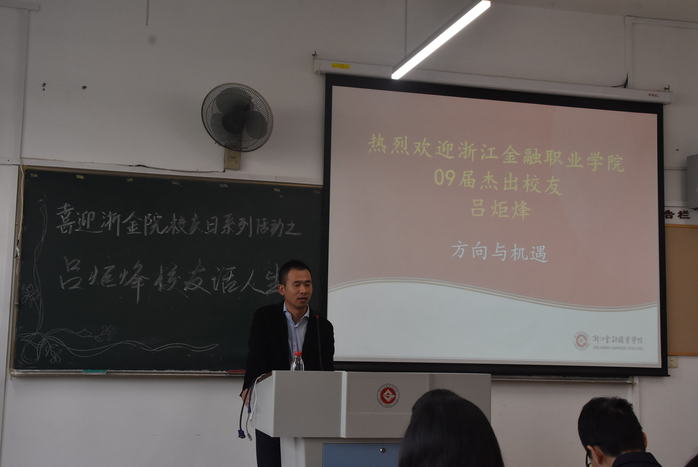 金秋送爽,丹桂飘香。11月2日,浙江金融职业学院迎来了四十四周年校庆日。金融管理学院邀请到国金061班优秀校友——深圳锦安控股杭州萧山分公司总经理吕炬烽,在八号楼8202教室为国金181班全体学生举行了“方向与机遇”的主题讲座。本次讲座的主持人是屠莉佳老师,主讲人为吕炬烽校友。