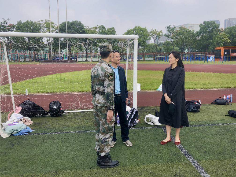 金融管理学院党总支书记钱利安,党总支副书记吴小燕,一早也来到了华夏运动场,与一营营长进行亲切交谈,就新生训练进度问题与新生身体健康情况,以及军训过程中遇上的问题与困难进行询问。并强调由于本次军训时间跨度长,工作难度大,要求教官们需要跟班,不仅要在训练过程中起作用,也要积极参加各个班级的日常活动。教官们穿上了军装就是军人,应该以更高的标准要求自己,具有团队意识的同时也要有服务意识,平衡好训练与学习之间的关系,同时在脱下军装后作为他们的学长学姐也要传播正能量,起到朋辈育人的作用。