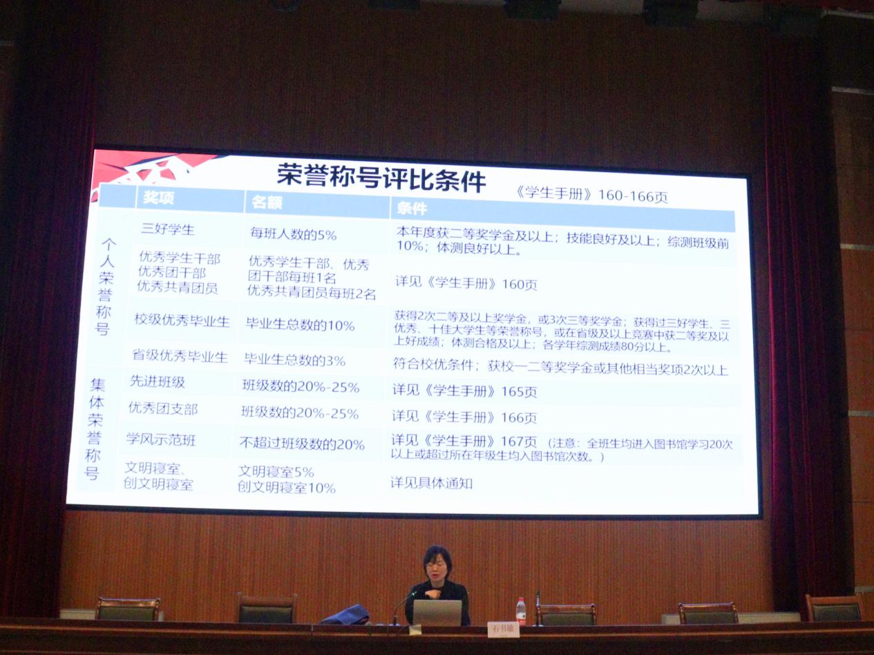 最后,石书敏老师再次强调了申请各类奖学金和荣誉称号的基本条件:一、具有我院正式学籍的全日制学生;二、热爱祖国拥护中国共产党的领导和改革开放政策;三、热爱所学专业,学习勤奋,严谨求实,用于进取,成绩良好;四、诚实守信,严于律己,尊敬师长,团结同学,关心集体,遵纪守法,热爱劳动,勤俭节约;五、积极参加体育锻炼,身体健康;六、在籍学生学满一年者,且获得专业要求职业资格证书。