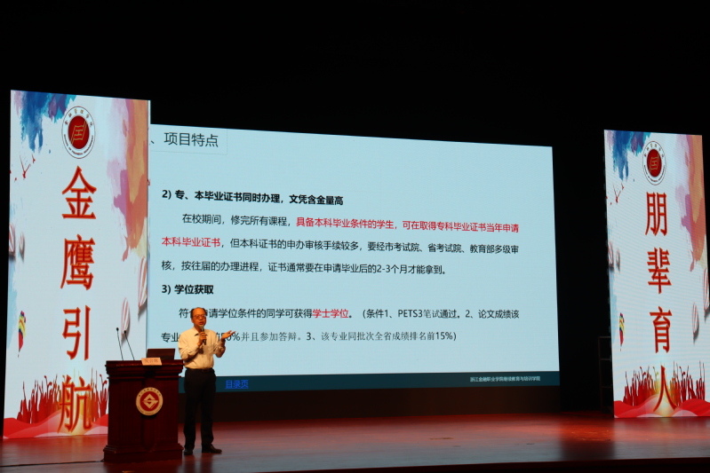 随后,王祝华院长强调了为什么要提高学历的几点原因:一、提升就业竞争力。单位招聘都要求本科以上学历,特别是金融系统;二、提高工资定级。用人单位通常按学历定薪资,本科学历的薪资往往高于专科;三、岗位竞争准备。部分单位岗位晋升的基本条件就是本科学历;四、为后续发展准备。具有本科学历,可直接报考全国统招研究生。