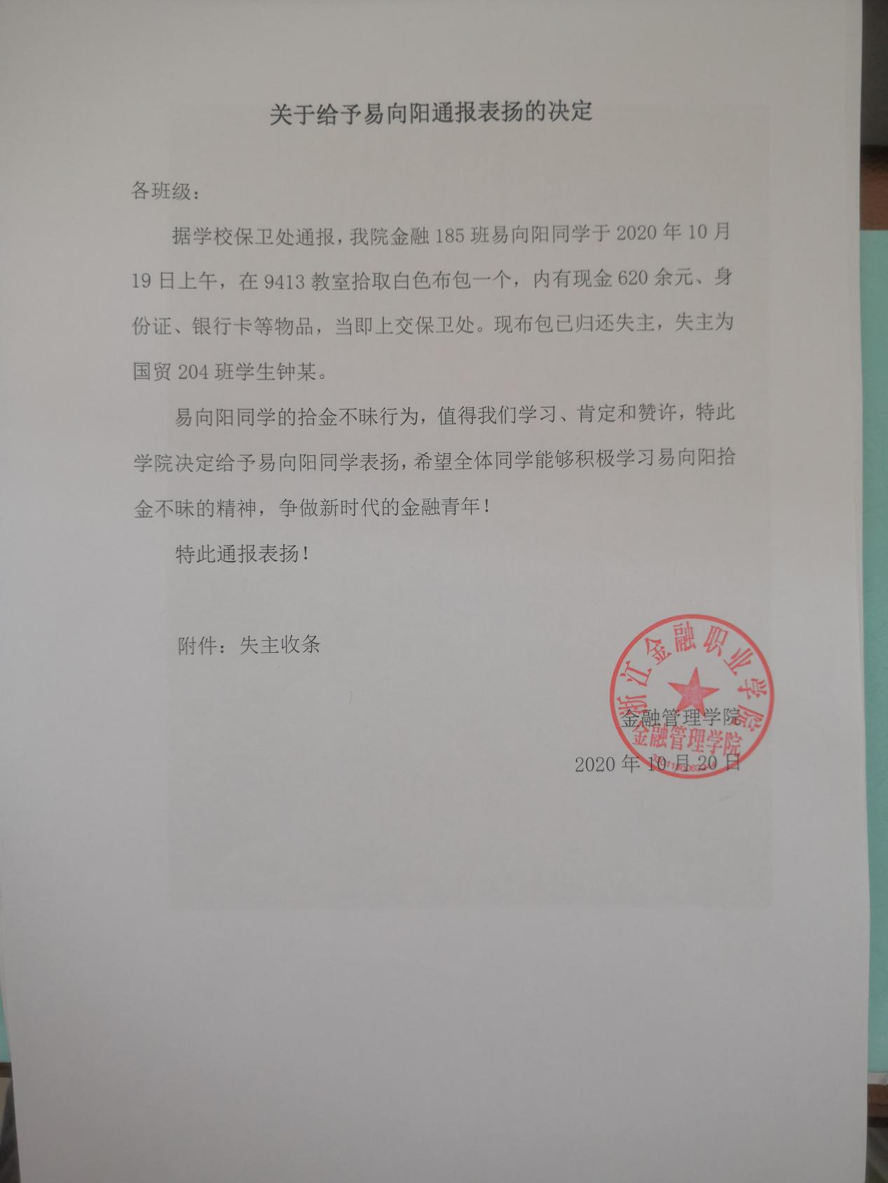 拾金不昧是我们中华民族的传统美德,是一个人高尚道德情操的体现。据学校保卫处通报,我院金融185班易向阳同学于2020年10月19日上午,在9413教室拾取白色布包一个,内有现金620余元、身份证、银行卡等物品,当即上交保卫处。现布包已归还失主,失主为国贸204班学生钟某。