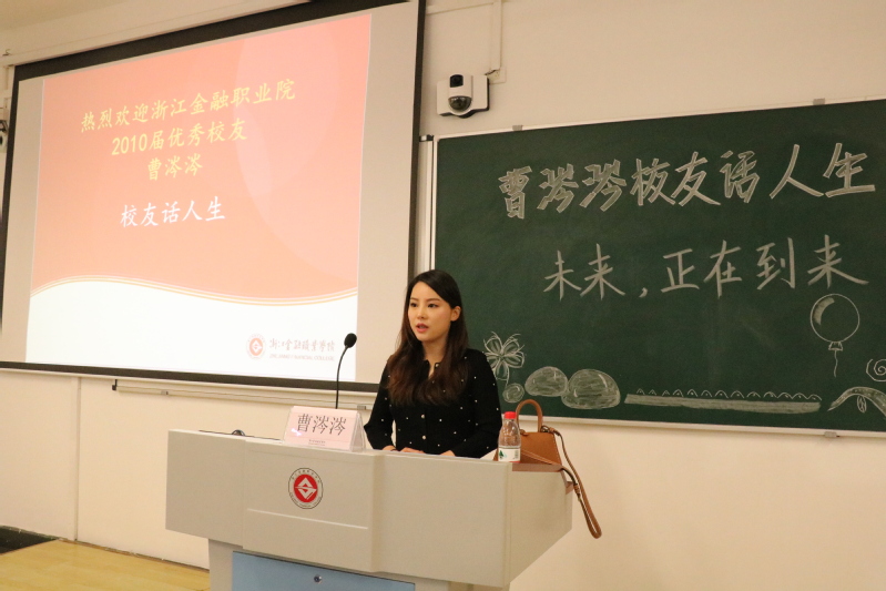 在这个秋高气爽的日子,浙金院迎来了45周年的生日,11月8日上午九点金融管理学院在8301教室,现任中国邮政储蓄银行彭埠支行行长的10届校友曹涔涔以 “未来,正在到来”为主题的讲座。曹涔涔校友以及大二学生参加此次讲座,主持人农村金融教研室讲师方宜霞。