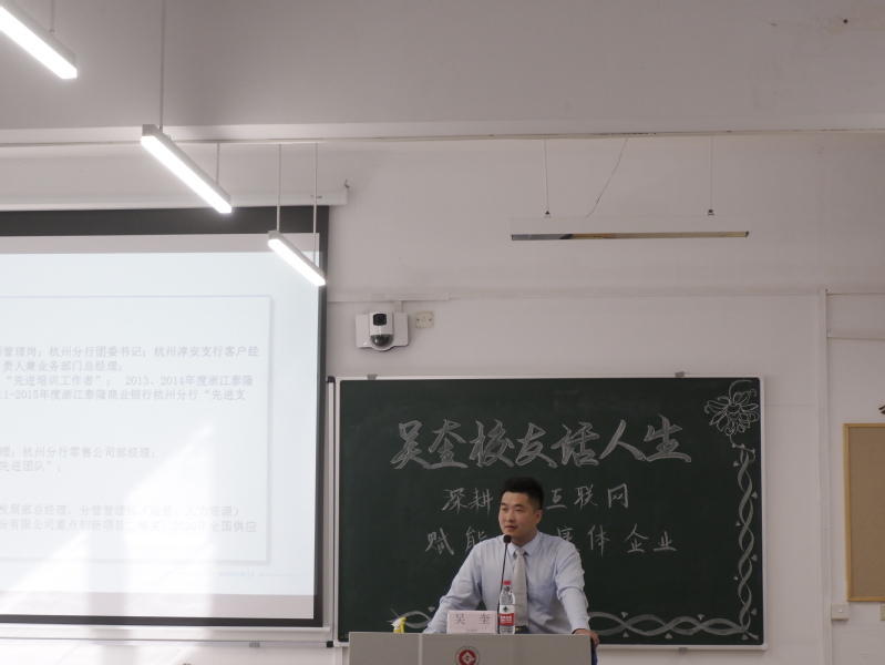 11月8日,金融管理学院有幸邀请到现任浙江物产经编供应链有限公司总经理助理兼金融工程部总经理的10届优秀校友吴奎,在恒丰教学楼8105开展校友话人生讲座。参加讲座的有金融195、196、国金191的全体学生,金融管理教研室副主任俞滨主持本次讲座。