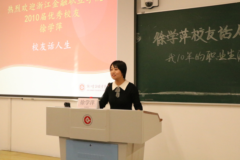 11月8日上午,金融管理学院有幸邀请到现任职于中国建设银行股份有限公司诸暨支行见习行长的10届优秀校友徐学萍,为金院学子分享人生感悟。农金192、金融学本科201班全体学生参加讲座,主持人国际金融专业汪卫芳教授。