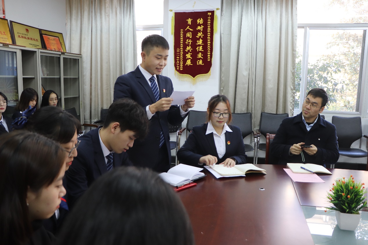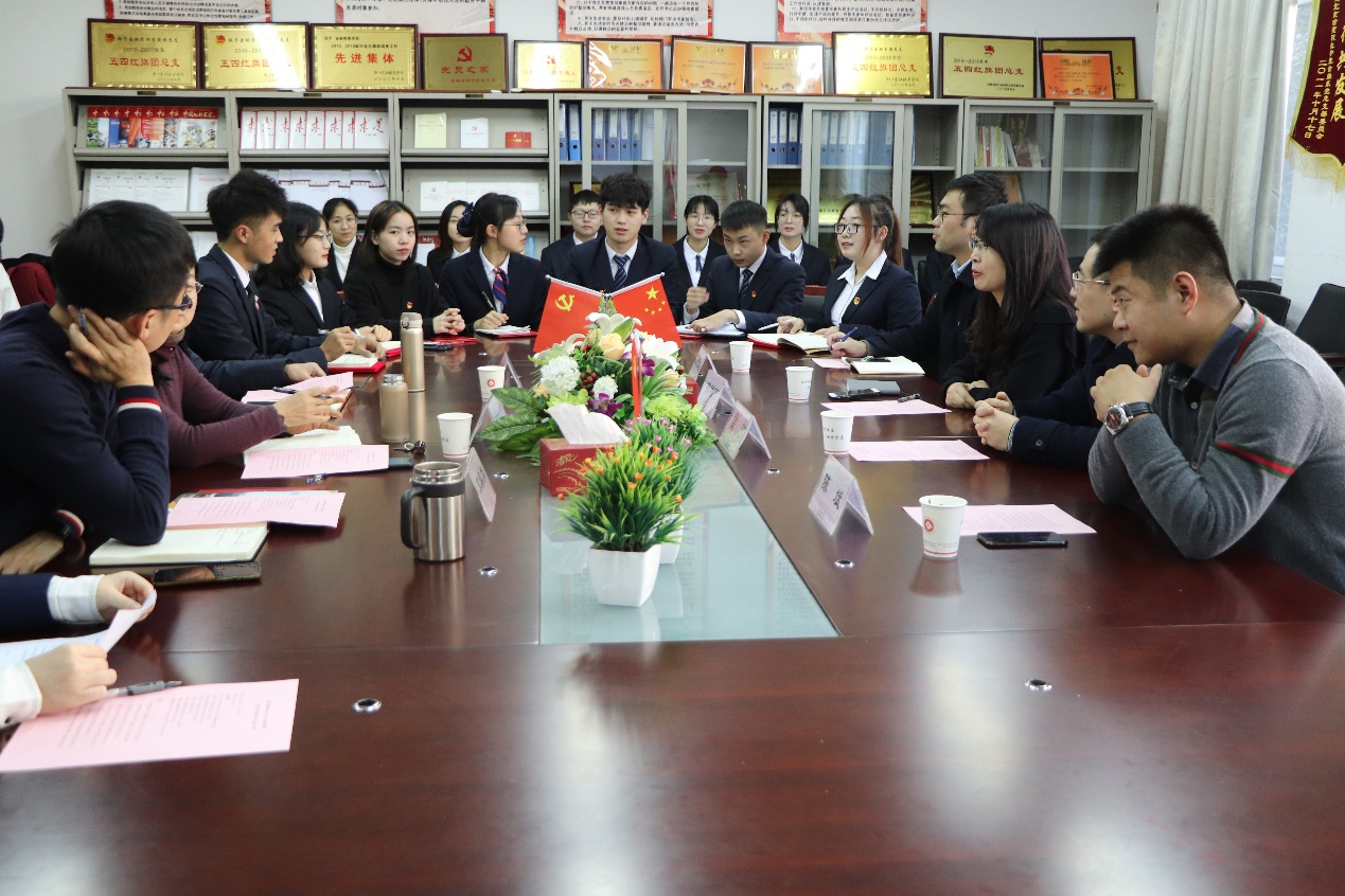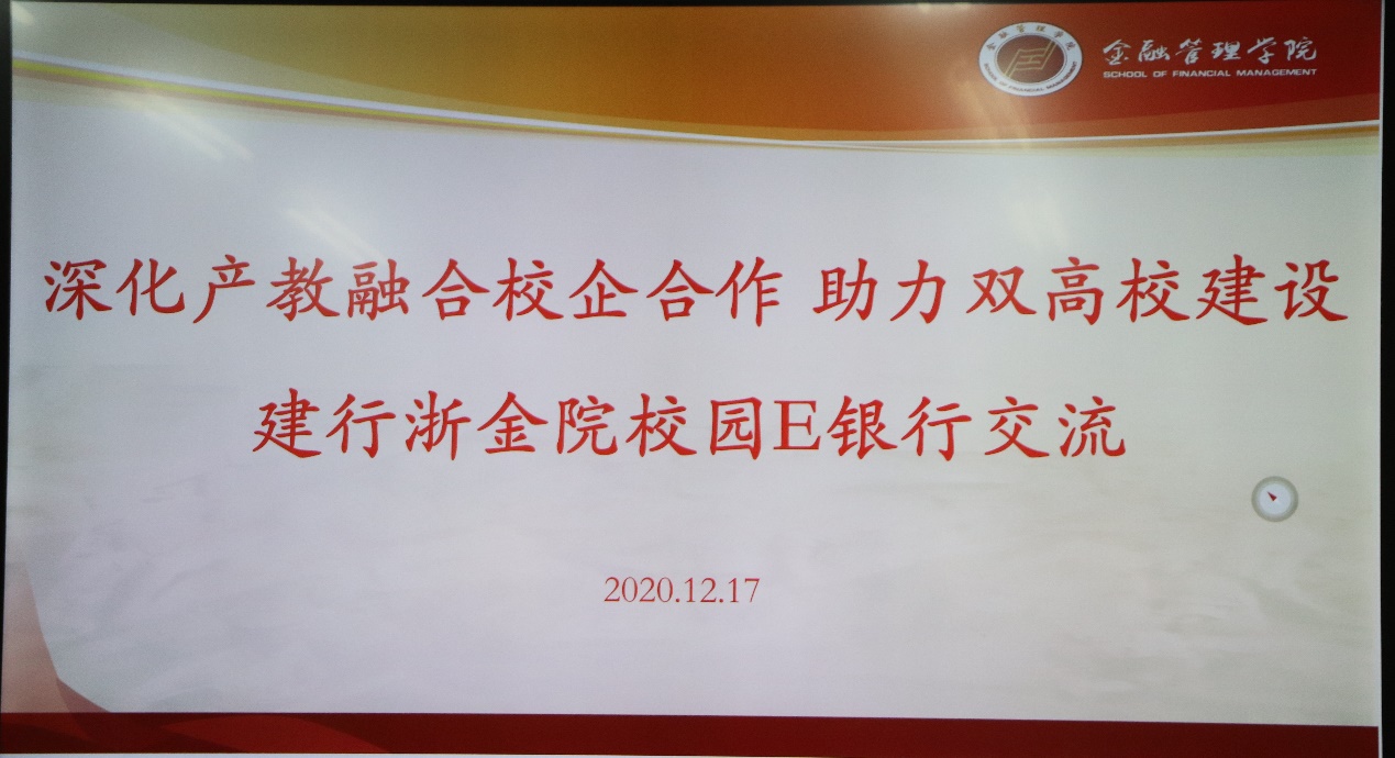为深化产教融合校企合作,助力双高校建设,浙江金融职业学院金融管理学院于12月17日在8218会议室举行了中国建设银行校园E银行交流会。参与此次会议的建行领导有:中国建设银行杭州分行网络金融部副总经理黄劼、中国建设银行滨江支行副行长邵梅丽、中国建设银行杭州彩虹城支行行长陈斌、中国建设银行杭州彩虹城支行客户经理安启龙;金融管理学院院长董瑞丽,金融管理学院党总支书记、副院长钱利安,金融管理学院学工办副主任宋春旗;以及金融管理学院第一届、第二届E银行成员,由浙金院第一届建行校园E银行副行长肖瑶同学主持本次会议。
