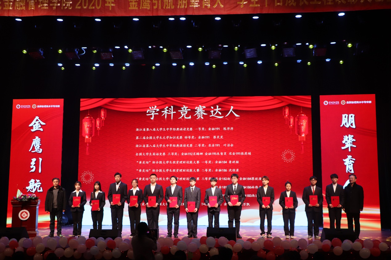 12月28日晚18点,金融管理学院在金葵花艺术中心隆重举行2020年“金鹰引航 朋辈育人”学生千日成长工程表彰大会暨迎新年晚会。莅临本次大会的领导与嘉宾有校党委委员、教务处处长、党委教师工作部部长孔德兰,党委委员、党办校办主任、党委宣传部部长张鹏超,纪检监察办公室主任龚宏富,招生就业处处长朱明,基建后勤处处长叶健,学生处处长、党委学工部部长王懂礼,人事处处长、党委组织部副部长谢峰,马克思主义学院院长邹宏秋,党委统战部部长、党委组织部副部长吴国平,图书馆馆长殷世波,银领学院党总支书记、副院长邵月花,淑女学院院长、教务处副处长王瑛,工会办公室(离退休工作办公室)主任张煜,实践教学与网络信息中心主任莫淦清,保卫处副处长王立成,校团委书记叶丛丛,金融管理学院院长董瑞丽,金融管理学院党总支、副院长钱利安,金融管理学院党总支副书记吴小燕以及金融管理学院全体师生、各二级学院学生代表参加本次大会。大会由金融管理学院副院长凌海波主持。