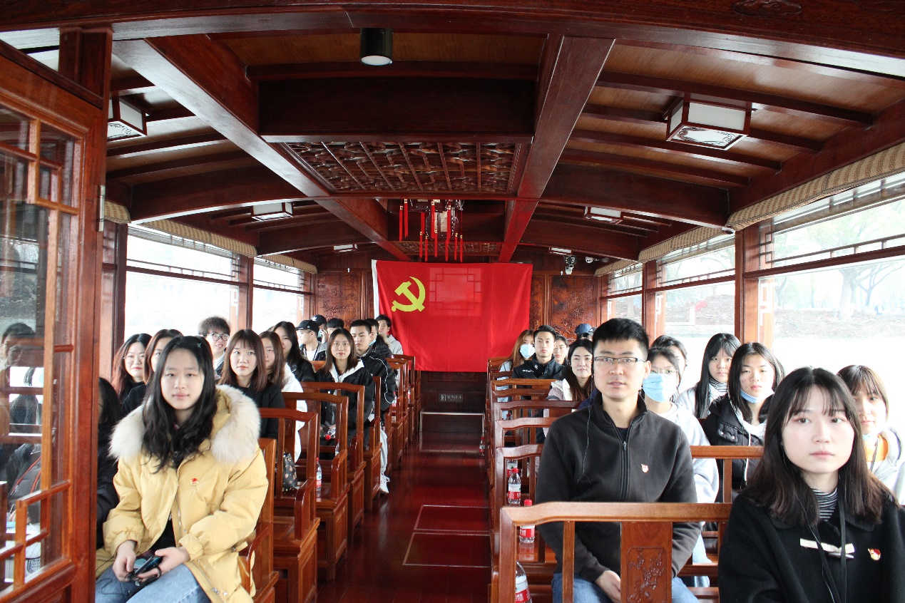 金融管理学院师生代表沿着当年“一大”代表走过的行程,从会景园坐船至狮子会渡口,瞻仰革命红船,体会“红船精神”在岁月中历久弥新,师生党员在红船旁重温入党誓词,让他们体会到“不忘初心、牢记使命、永远奋斗是中国共产党人永葆青春活力的秘诀”;团学干部在红船前发起金融学子青年倡议。烟雨楼下楹联所书的“烟雨楼台,革命萌生,此间曾着星星火,风云世界,逢春蛰起,到处皆闻殷殷雷”苍穹有劲,带领学子们走入历史画卷,与革命前辈进行思想对话,汲取精神力量,认识到自己在新时代中可以担当大任、干出精彩。在游船上听“一条小船和一个大党的故事”并观看习近平总书记莅临嘉兴南湖,回望历史先辈丰功伟绩的纪录影像,习近平总书记强调“上海党的一大会址、嘉兴南湖红船是我们党梦想起航的地方。我们党从这里诞生,从这里出征,从这里走向全国执政。这里是我们党的根脉”。在船上大家互相分享自己近段时间来学习党史的心得,结合当下寻访红色印记的体会,学党史是为了从百年荣光中汲取更好奋进的力量。也分享了在疫情期间不断涌现的榜样力量,在卫国戍边英勇抗争的战士事迹,让人感受到“红船精神”并未消逝在时间的长河中,相反的一辈辈青年用自己的方式坚守自己岗位,为时代增添色彩,也为“红船精神”发出最强音。党员代表们纷纷填写承诺卡,在合唱的一首首红歌中结束本次了体验式学习。