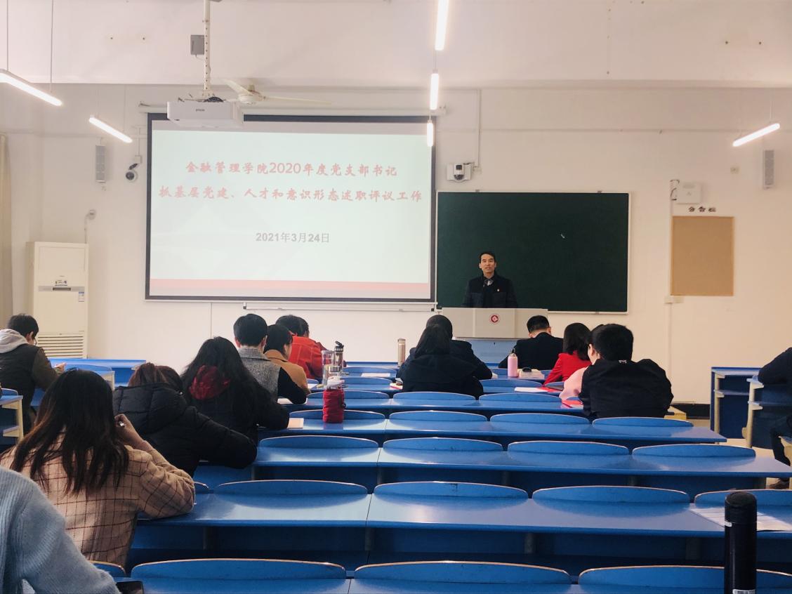 为深入学习贯彻习近平新时代中国特色社会主义思想、党的十九届五中全会精神,认真落实《高校基层党支部建设标准》,按照新时代党的建设的总要求,推动全面从严治党向基层延伸,不断提高基层党建质量,根据上级党组织有关要求,3月24日下午,金融管理学院党总支于8207教室开展2020年度党支部书记抓基层党建、人才和意识形态述职评议工作,学院全体党员参会,会议由学院党总支书记钱利安主持。