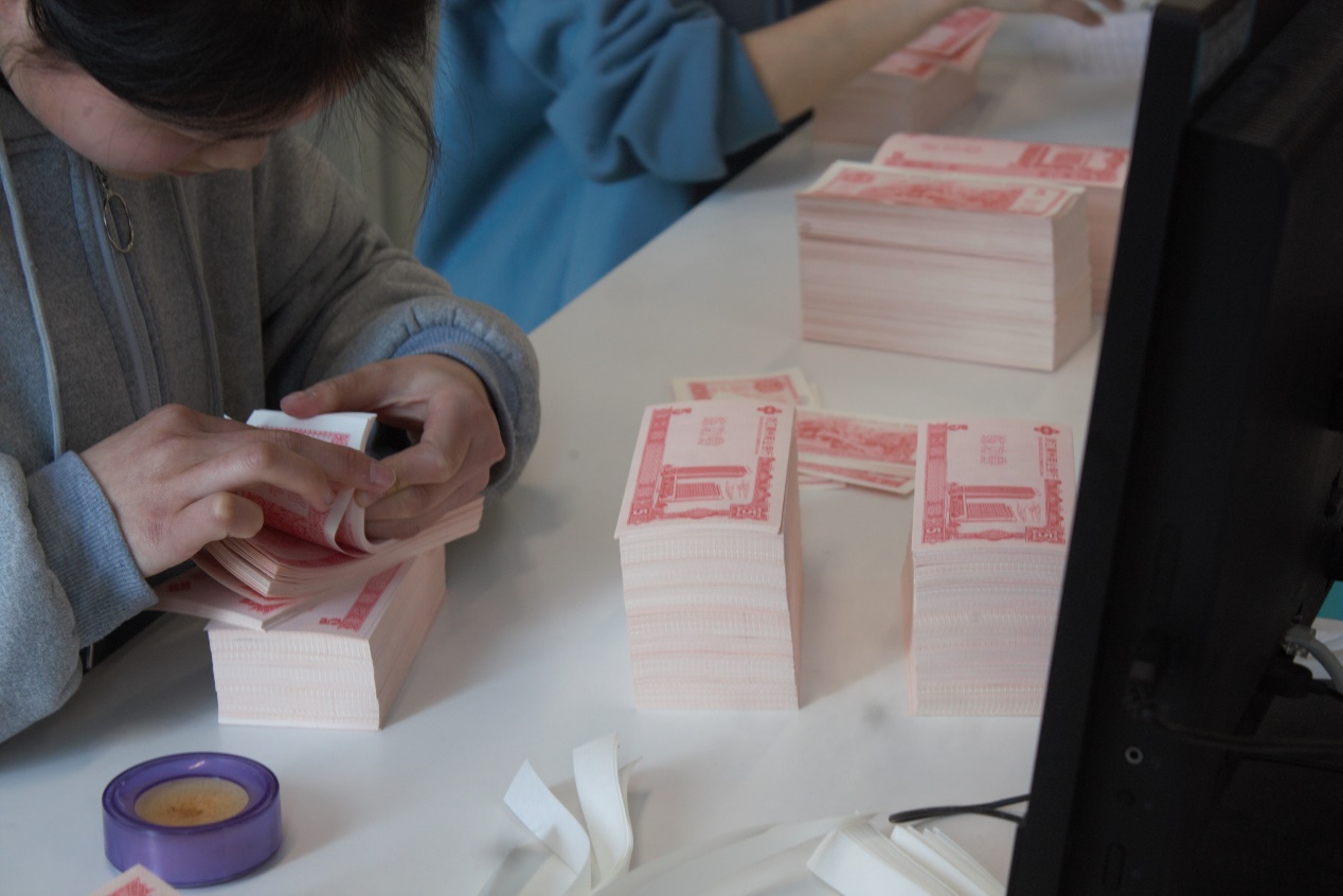 最后一个比赛项目是点钞。点钞比赛分为单指和多指,首先进行的是单指比赛,比赛时长为五分钟。比赛开始,选手们迅速拆掉捆钞条,熟练地清点起来,清脆的点钞声不断持续着,桌子上清点完的钞券不断增高,那是选手们苦练的成果。两轮单指过后是多指,选手们的多指手法丝毫不逊色于单指,正确的点钞手法以及坚持不懈的努力造就了优秀的点钞水平。