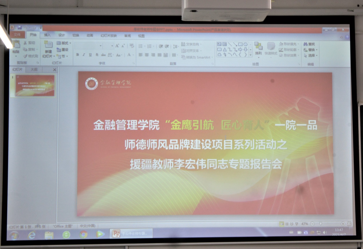 4月7日,金融管理学院组织召开“金鹰引航 匠心育人”师德师风品牌建设项目系列活动之援疆教师李宏伟同志专题报告会,金融管理学院全体教师参加本次专题报告会,会议由金融管理学院党总支书记、副院长钱利安主持。