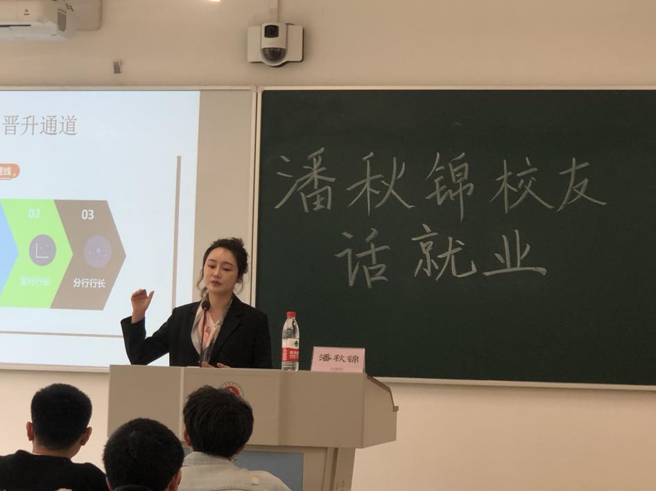 潘秋锦在大二期间进入邮政储蓄订单班学习,2011年毕业后在银行工作。讲座开始,潘秋锦分享自己10年的银行工作经历。回忆当初入选订单班时的激动,内心充满对母校的感激,她也表示正是因为学院的订单班平台让来自成都的她在杭州这座城市顺利就业。她鼓励学弟学妹们勤练技能,珍惜并利用好学院给予的就业机会,充分发挥自身优势,提高就业竞争力。接着,她详细讲解了银行的各类岗位,晋升通道,银行业未来的发展趋势,并为学弟学妹们的银行职业规划提供发展路径参考。最后,分享了她10年来在银行工作的感悟,给在校学子提出了以下几点宝贵建议: