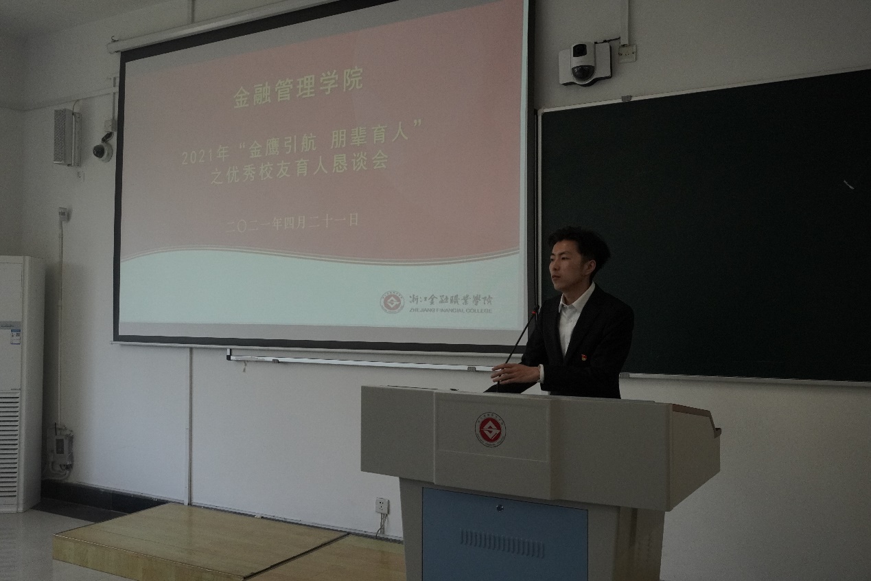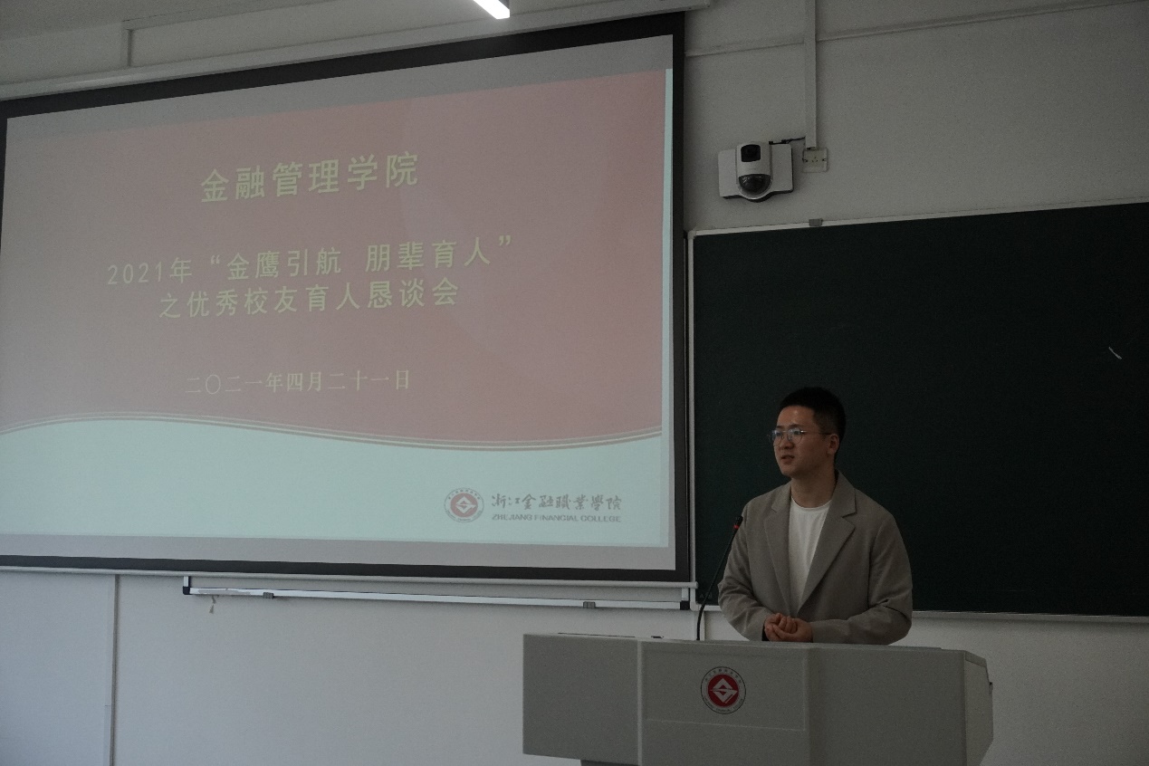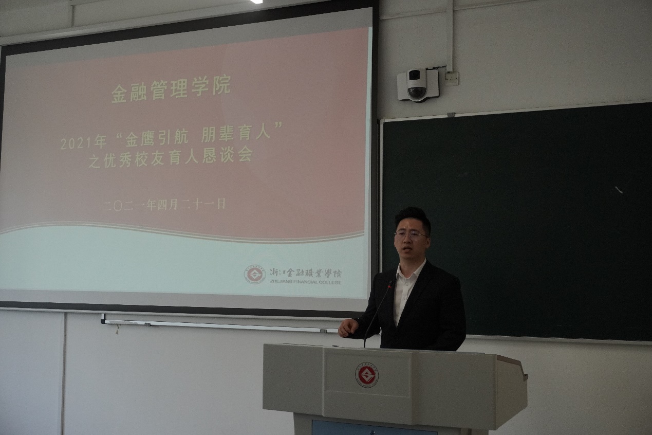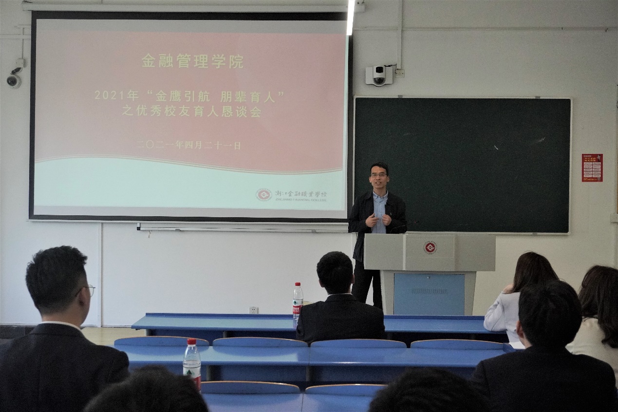 在建党一百周年来临之际,为扎实推动2022届学生就业工作,给学生提供就业指导,提升学生各方面综合素质,使同学们能更好地了解当今金融行业、职业情况,更好掌握工作岗位的要求。4月21日下午,金融管理学院在8207教室举办了“金鹰引航 朋辈育人”之优秀校友育人恳谈会,出席本次活动的有学院党总支书记、副院长钱利安,党总支副书记吴小燕,农金教研室副主任俞滨和金融管理学院副教授翟敏,部分师生代表以及多位优秀校友代表。本次活动由钱利安主持。