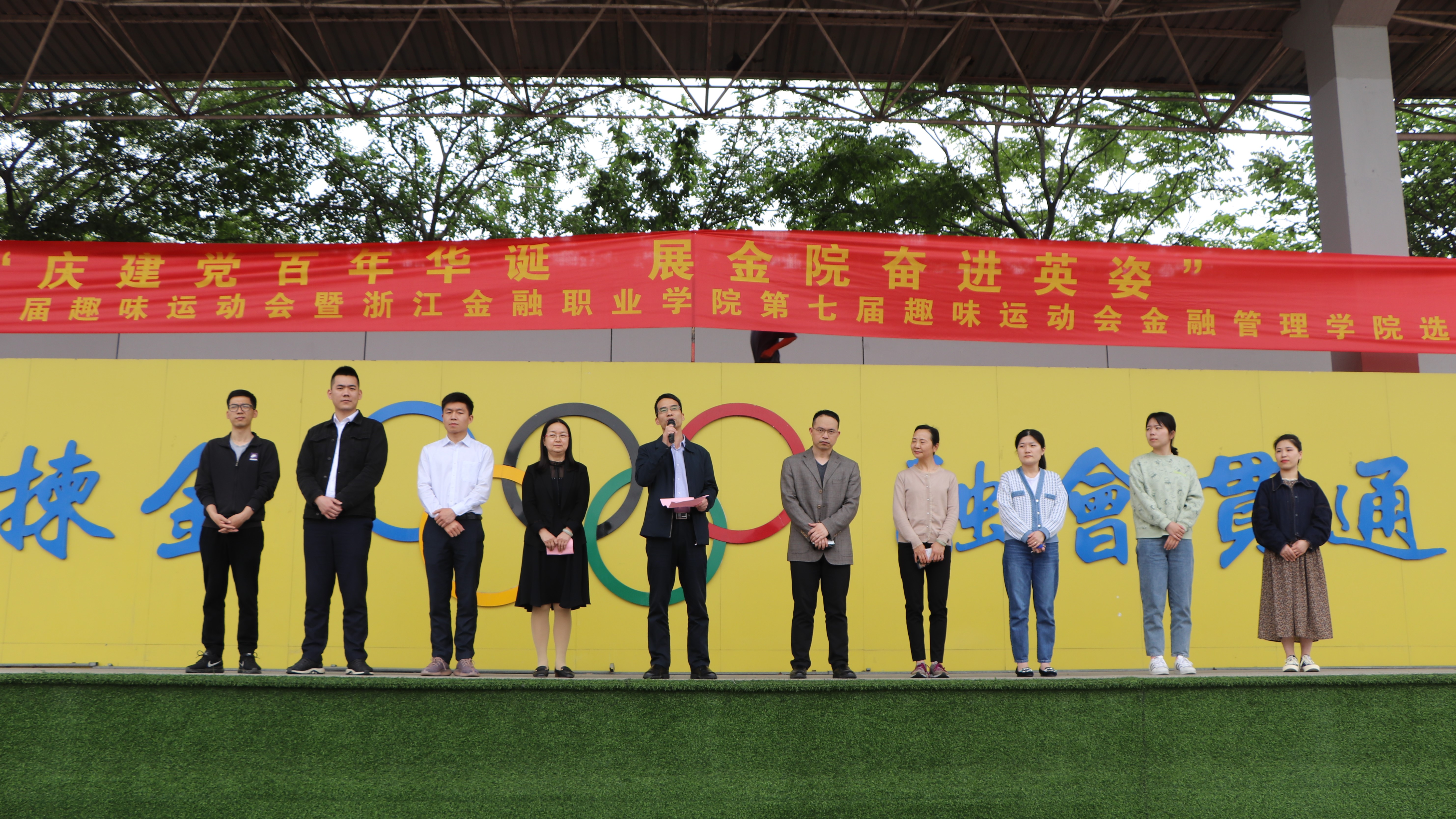 为庆祝中国共产党建党百年华诞,推动学院群体性体育运动的广泛开展,2021年4月28日下午,在华夏运动场举行“庆建党百年华诞 展金院奋进英姿”金融管理学院第八届趣味运动会暨浙江金融职业学院第七届趣味运动会金融管理学院选拔赛开幕式。到场领导及嘉宾有:金融管理学院院长董瑞丽,学院党总支书记、副院长钱利安,副院长凌海波,银行业务教研室主任韩国红,国金教研室副主任朱莉妍,农金教研室副主任俞滨,辅导员夏佳颖、沈嘉辉以及郑伟杰、俞杨龙两位优秀校友。本次开幕式由郑佳业,陈文慧主持。