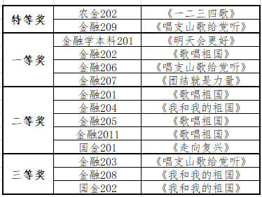 4月22日下午,国金201班级合唱的《走向复兴》率先拉开了合唱大赛的序幕。随后的比赛中,参赛班级每班献唱一首歌曲。经过激烈的角逐,由学院主席团打分最终评选出特等奖2名、一等奖4名、二等奖5名、三等奖3名。获奖情况如下: