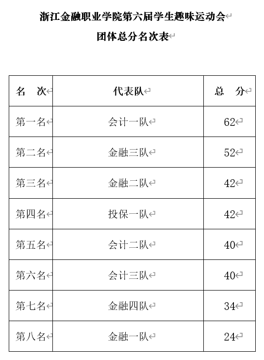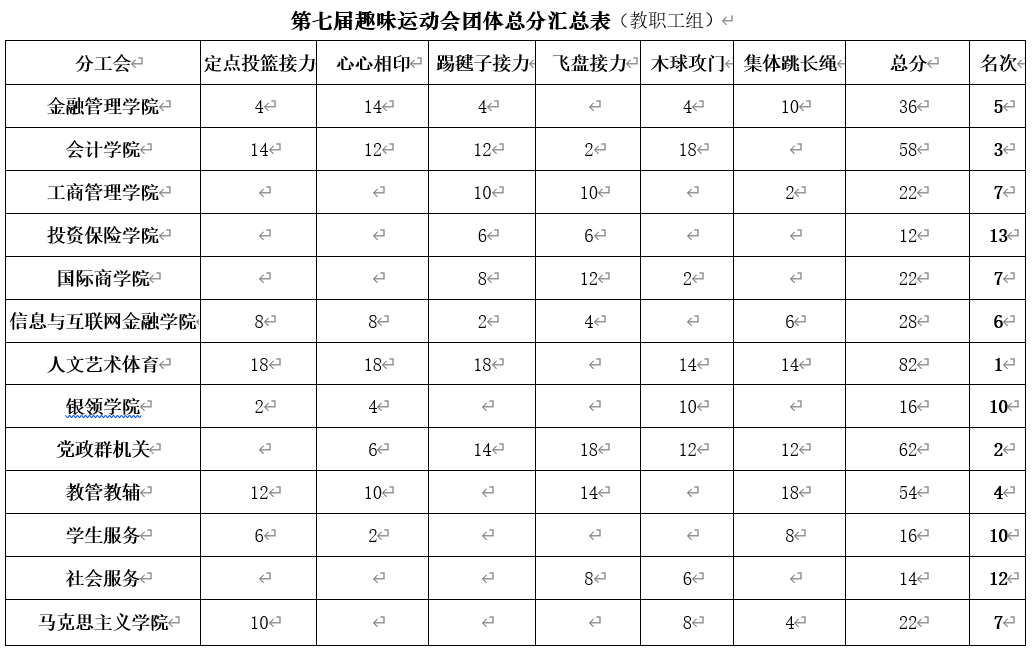 本次趣味运动会共分为定点投篮接力、心心相印、齐心协力、“旋风跑”接力、踢毽子接力、“8”字形集体跳长绳、飞盘团队赛接力及木球攻门八个比赛项目,分为教师和学生两组。学院教师与学生代表队,通过团队合作配合、昂扬的斗志以及执着拼搏的精神,完成了一个又一个考验,最终获得了喜人的成绩,金融管理四支学生代表队均进入学生组前八名;金融管理学院分工会也获教工组前八名的成绩。具体成绩如下: