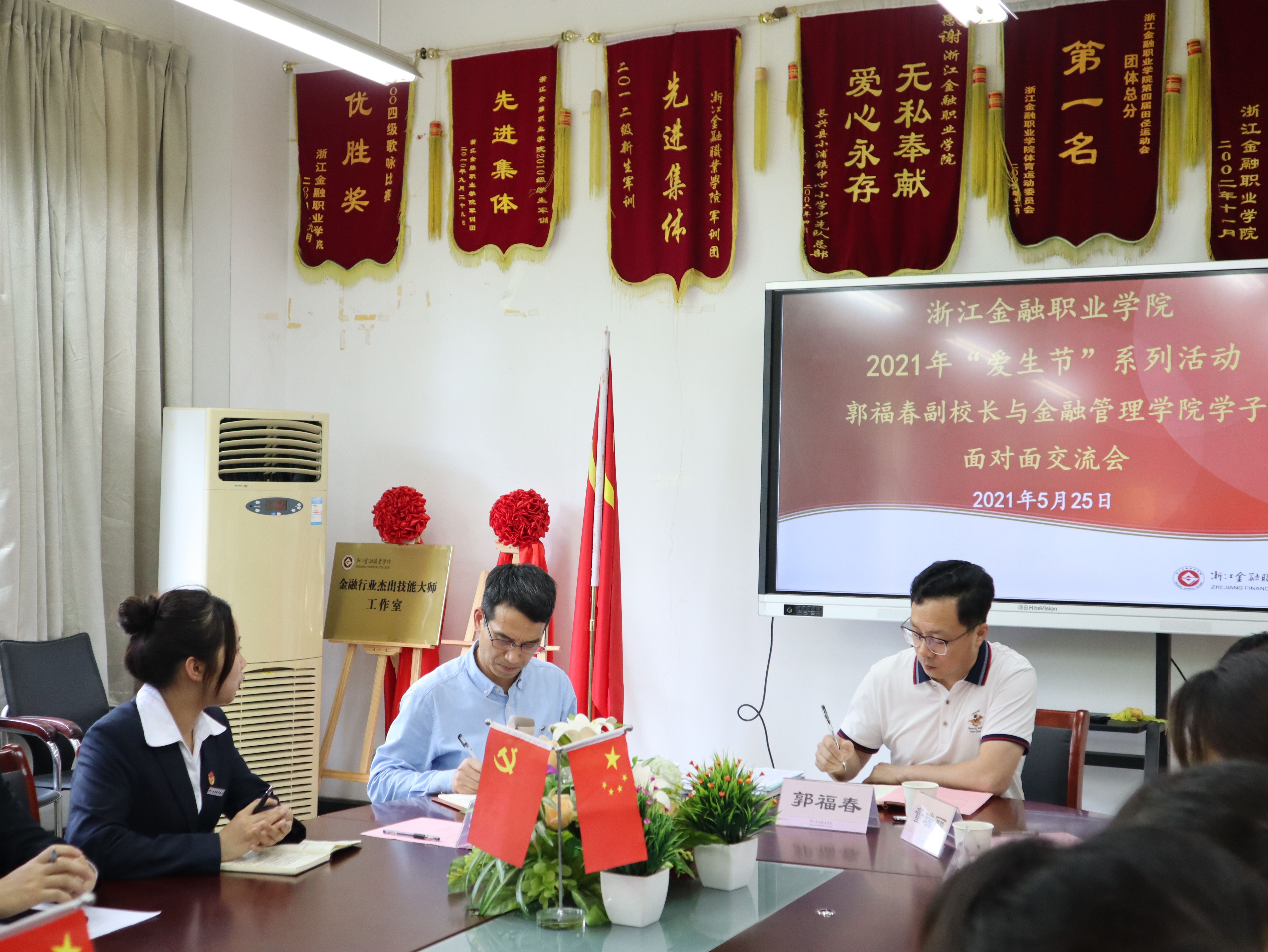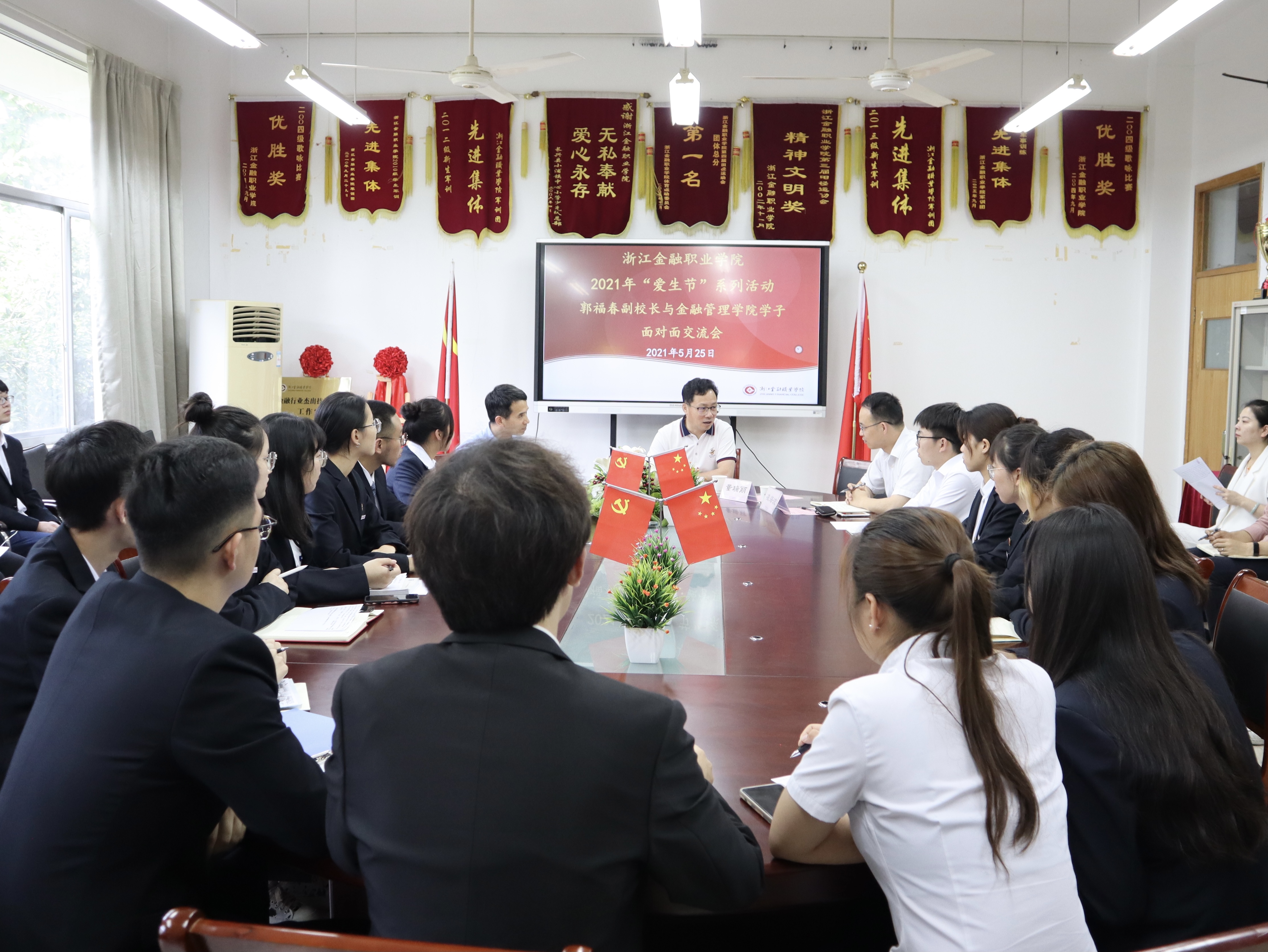 为迎接中国共产党百年华诞,结合我校“十四五”时期“建标杆、扩校区、升本科”三大使命,更好的推进金融管理高水平专业群建设,在学校第十四个“爱生节”活动期间,金融管理学院于5月25日下午在8218会议室召开师生圆桌会,浙江金融职业学院副校长郭福春出席本次师生圆桌会,并与金融管理学院学生代表面对面沟通交流,听取学生关于我校高素质专业技能人才培育的意见建议。金融管理学院党支书记、副院长钱利安,金融管理学院副院长凌海波,学院办公室主任林艳琼,学院学工办副主任宋春旗,学院全体辅导员以及学院学生代表参加本次活动。