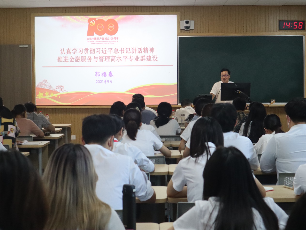 9月22日下午,为深入学习习近平总书记在庆祝中国共产党成立一百周年大会上的重要讲话精神,持续加强党史学习教育,学校党委委员、副校长郭福春给金融管理学院全体师生党员讲授了专题党课,党课由金融管理学院党总支书记钱利安主持。