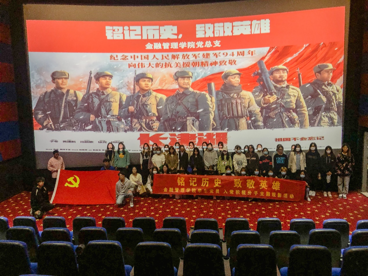 10月25日为抗美援朝纪念日,为了铭记历史,致敬英雄,深入开展党史学习教育,金融管理学院党总支在2021年10月25日晚组织学院学生党员、入党积极分子观看电影《长津湖》。