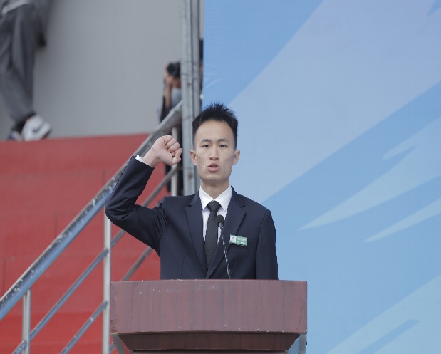 运动员代表金融191班吴宇杰宣誓和裁判员代表郝大龙进行宣誓,只有全体裁判员、工作人员坚守岗位、公正裁决,才能确保运动会各项秩序的顺利进行,本届运动会才能举办成一届精彩纷呈的、充满正能量的体育盛会。