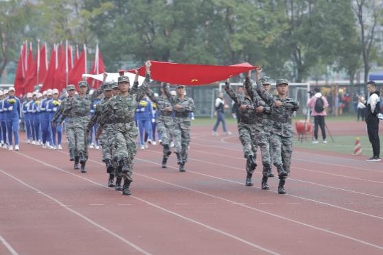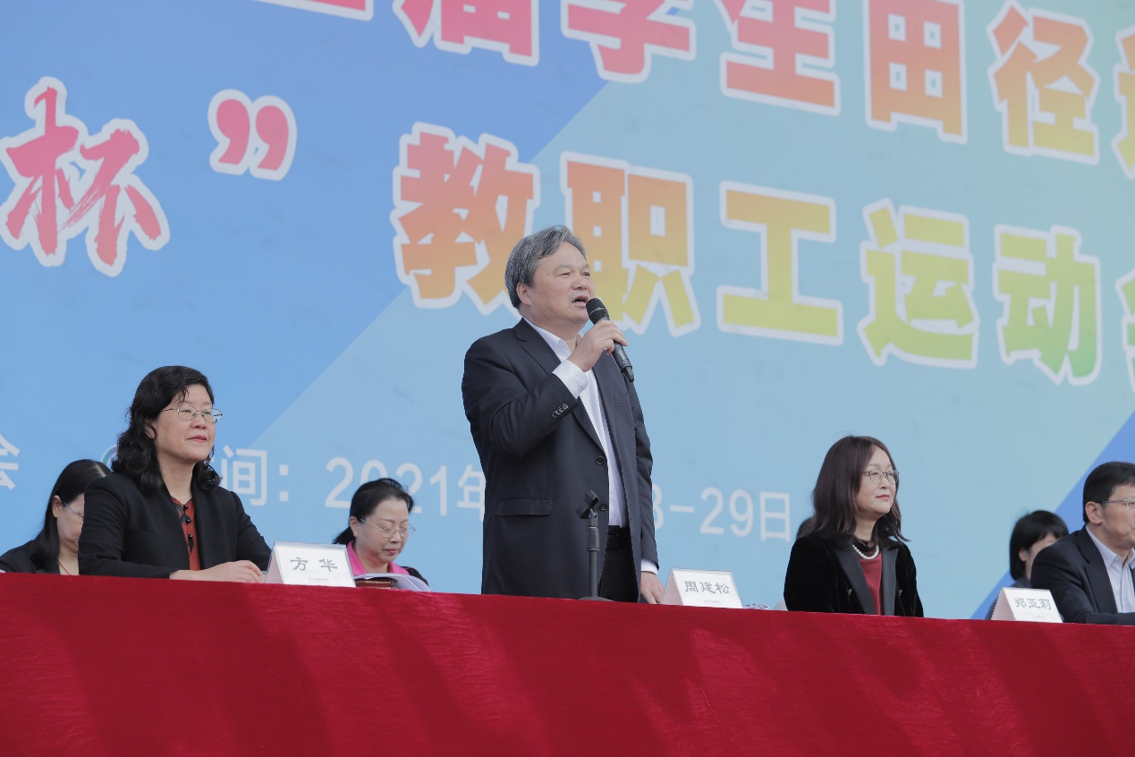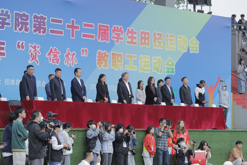 在所有方阵入场完毕之后,激昂而又神圣的《义勇军进行曲》响起,在全体师生肃穆而庄严的注目下五星红旗冉冉升起。随后浙江金融职业学院党委书记周建松宣布浙江金融职业学院第二十二届学生田径运动会暨2021年“资信杯”教职工运动会正式开幕。