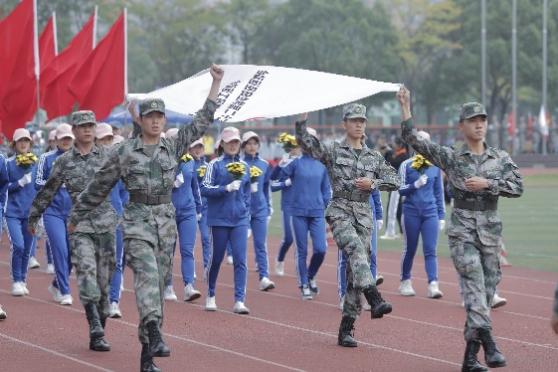 彩旗飘扬,迎风招展。各个设计别出心裁的方阵在彩旗下、乐声里依次入场。首先入场的是金融管理学院代表团,他们精神饱满,铿锵有力的口号声在田径场久久回荡。“金融风华,雄姿英发;百年奋斗,圆梦今朝;金院窗口,建设有我;请党放心,强国有我”的口号与他们身上中国红的运动服一起在这广阔的田径场上谱写属于他们胜利的篇章。