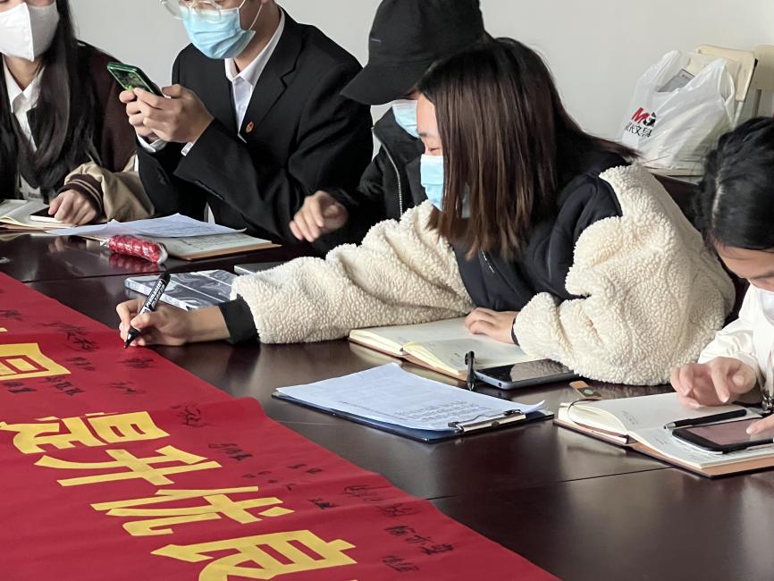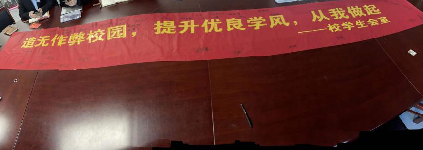 最后,进行了团学委学风学纪管理建设活动,各团学委负责人纷纷在横幅上签字,表明自己以身作则,杜绝作弊,以信立身的决心。