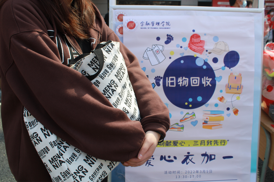 三月春风处处留,雷锋精神心中有。“雷锋”二字已成为人们心中热心公益、乐于助人、善待他人、奉献爱心的代名词。三月是雷锋月,为弘扬雷锋精神,营造良好的氛围。2022年3月9日,金融管理学院青年志愿服务部在学校财通广场举办“旧物献爱心 三月我先行”爱心衣加一旧物募捐志愿活动。