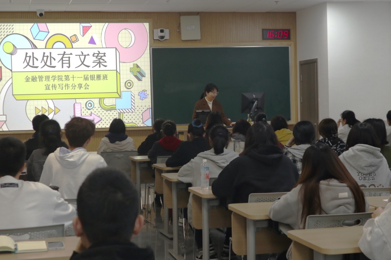 为强化银雁班同学的语言表达写作能力,提高文学素养。3月29日下午金融管理学院于泰隆110开展“处处有文案“宣传写作分享会。本次分享会由金融管理学院辅导员沈嘉辉主持,银雁班全体同学参加。
