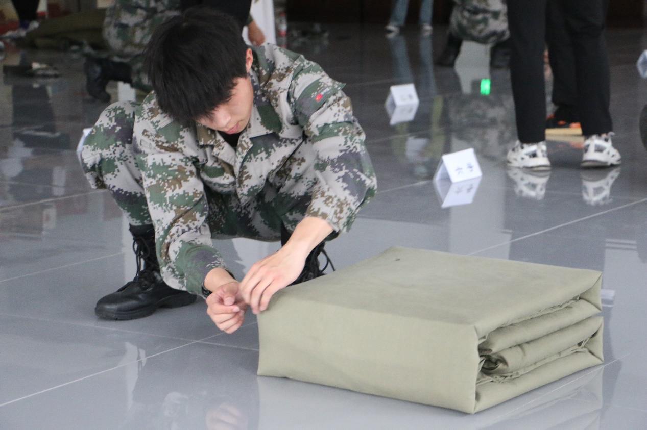 叠被子正式开始!分为两组,一组八人,同学们轮流发表了宣言,动员大家士气。只听一声“开始”,同学们迅速蹲下,熟练地叠起被子,在8分钟的比赛时间里,每个同学的被子都成了整整齐齐、方方正正、有棱有角的“豆腐块”。“时间到”,同学们立刻起立,站在自己的“作品”前,等待点评、打分。在激烈的比赛中,选手们个个叠法熟练,精神集中,无不展现军营的昂扬向上、一丝不苟的精神风貌。随后,生活委员们学习了如何叠好被子,并从叠被子这件小事做起,带动全班养成良好的生活习惯。最后,傅宁宁对此次比赛发表点评,他首先表示很高兴参加这次比赛,学到了很多关于叠被子的注意事项和技巧。其次,在寝室建设方面和劳动教育方面,叠被子虽然是日常工作,但是优秀习惯的传递。最后,希望通过兵心工作室这次活动,把这个优良习惯传递给身边人,在日常生活中培养好习惯,让这种文明之花处处盛开、永远盛开。