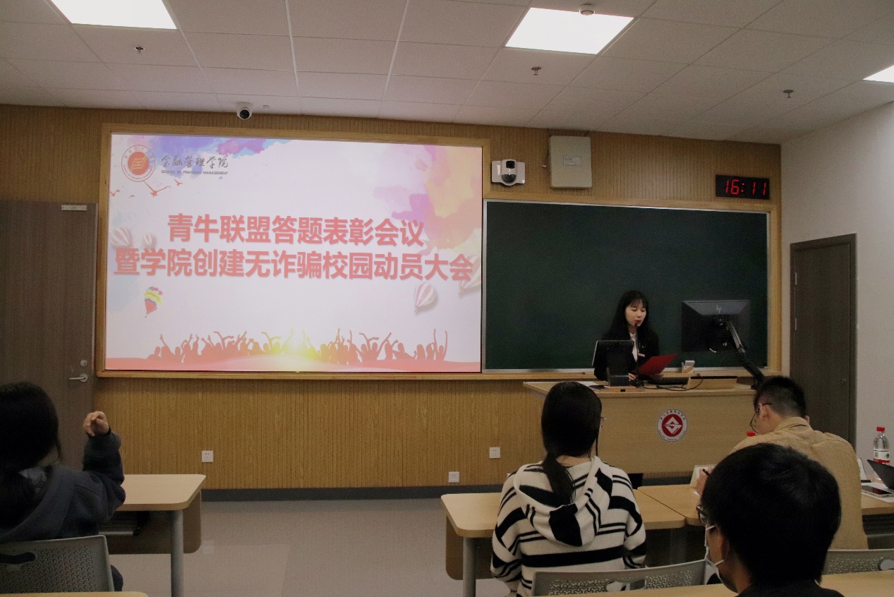 为鼓励学生积极参与青牛联盟答题,增强同学防诈骗意识,进一步有效开展防范教育,打造平安校园,启动反诈骗宣传教育活动。金融管理学院于4月28日下午在泰隆110教室举行青牛联盟表彰会议暨学院创建无诈骗校园4月阶段总结大会。出席本次表彰仪式的有金融管理学院学工办辅导员李朝奔、葛东方、彭采婧,以及各班反诈大使。仪式由池一鸣主持。