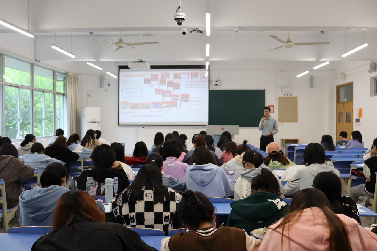 之后,宋春旗引用《新青年》杂志中李大钊《青春》一文,告诉同学们新青年应响应号召,冲锋在前,体现出时代新人的责任感与正义感;引用“第一颗原子弹”及“忠心报国”的事迹,阐述出有志青年应是与历史同向、与祖国同在、与人民同在,全心全意为人民服务,要有创新和开拓精神。接下来他解释了时代新人当何为:在一方有难时,时代新人应伸出援助之手,要加强使命感与责任感。