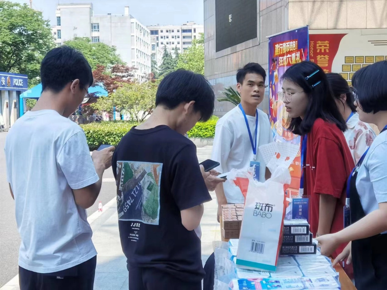 在金融管理学院党总支与中国建设银行杭州滨江支行党总支顺利举行党建共建签约仪式暨数字人民币揭牌仪式的同时,为了能够让大家抢“鲜”一步体验数字人民币。5月6日下午校园e银行联合金融管理学院青年志愿者部门在财通广场进行第二届“金融知识进校园”知识竞赛,现场指导同学们如何激活和使用数字人民币。