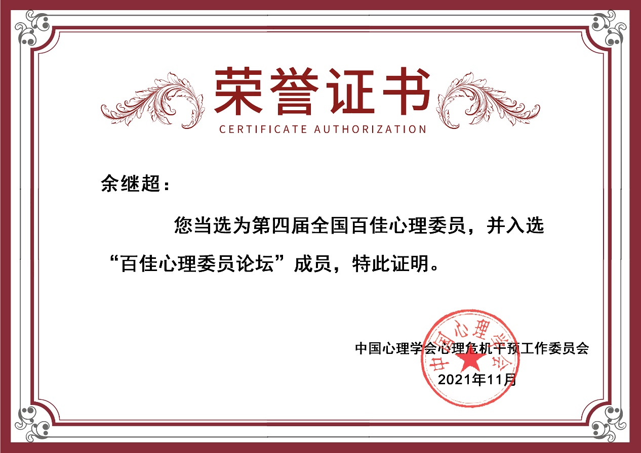 通过第四届“全国高校百佳心理委员”评审专家委员会的评审,金融管理学院余继超从400多名侯选人中脱颖而出,荣获第四届“全国百佳心理委员”称号。