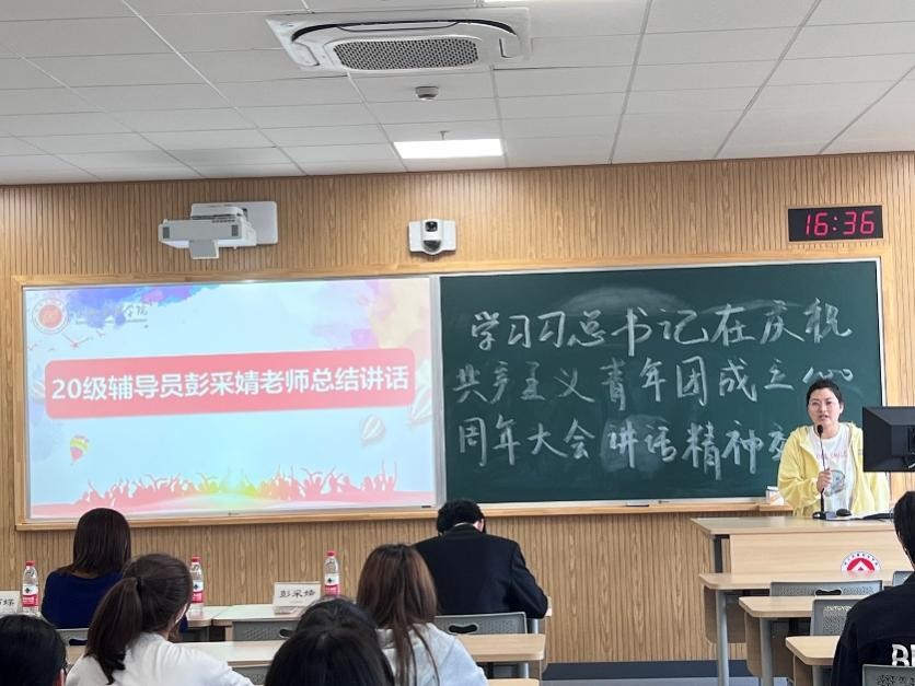 本次主题团日活动从全体奏唱中国共产主义青年团团歌、全体重温入团誓词、团总支副书记余继超学习成果分享、彭采婧老师总结发言这四大部分开展交流。