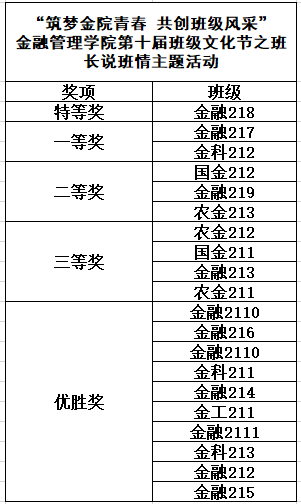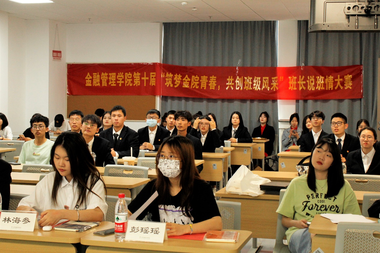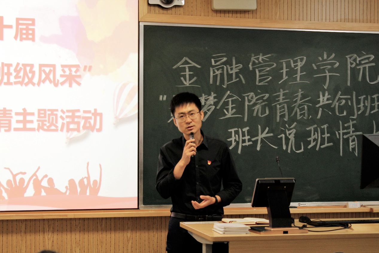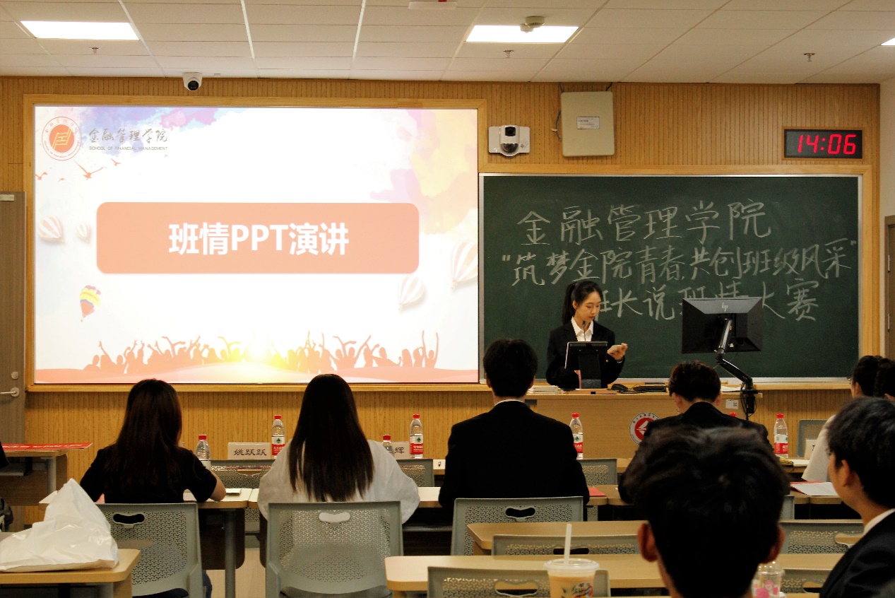 为营造良好学风探索新路径,积极探讨新方法,加强各班联系,展现各班集体独特的魅力和文化。金融管理学院于5月18日在泰隆110教室举办了第十届班级文化节之“筑梦金院青春,共创班级风采”班长说班情活动。金融管理学院团总支书记、学工办副主任宋春旗,学院学工办辅导员沈嘉辉、李朝奔、彭采婧,学院团学委代表及各二级学院学生会主席参加此次活动,并邀请联合学徒201班(原金融209班)班长郑佳业做嘉宾。本次活动由金融216班傅琳莉主持。