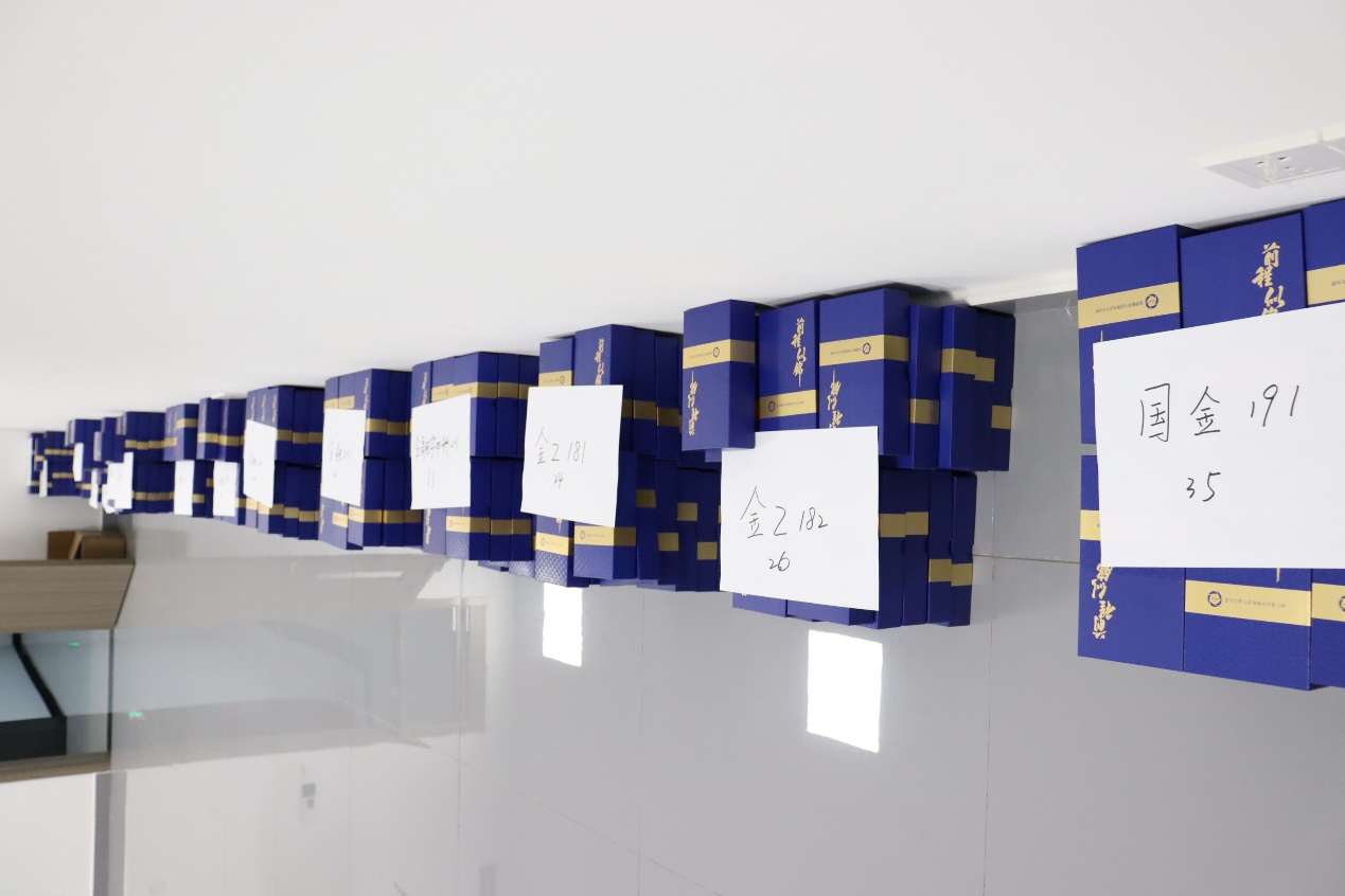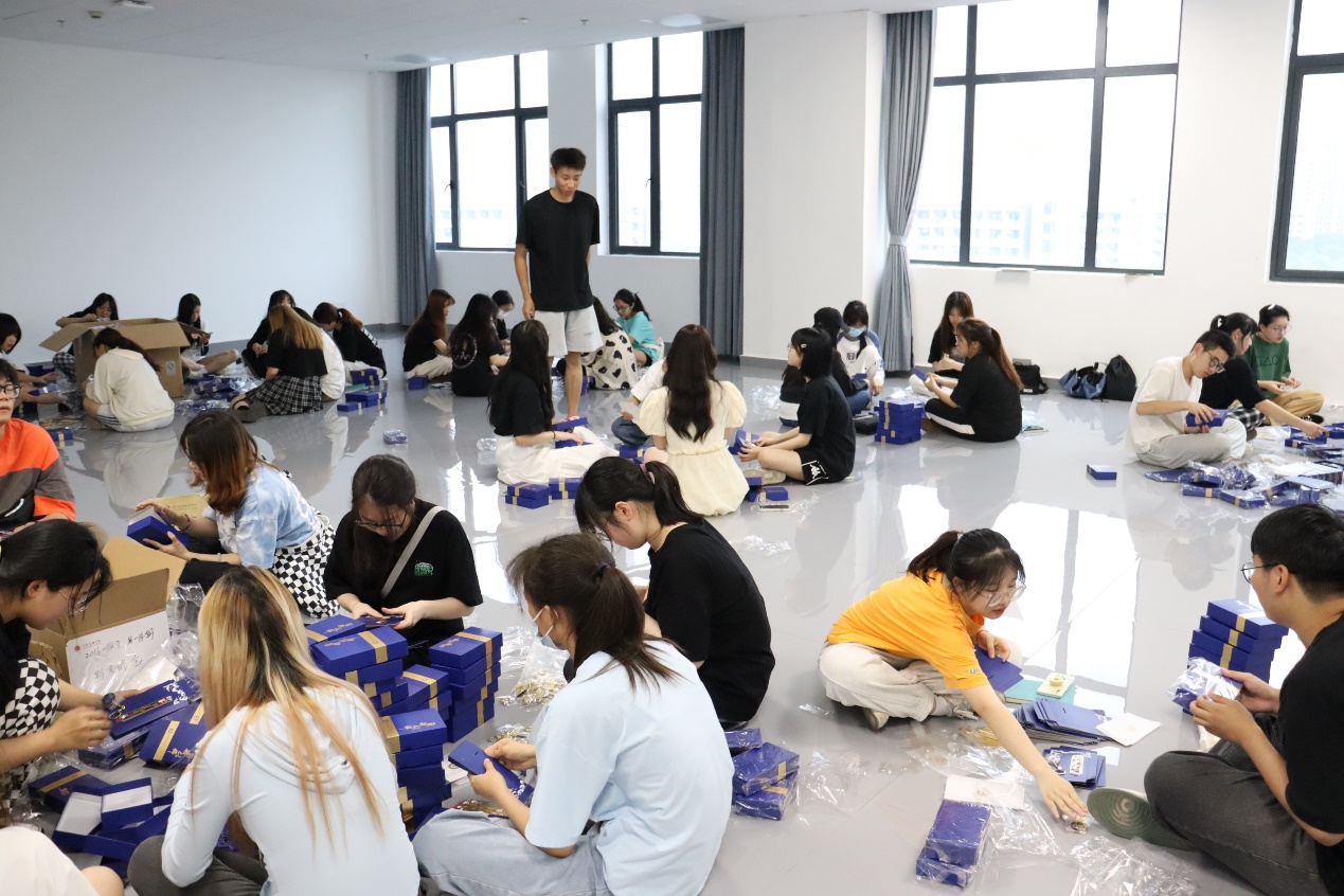 同学们围坐在大箱子边上,地上摆放着印有“前程似锦”的金色直尺与金融logo的挂饰,他们分工有序,有条不紊地进行着礼盒的组装,在短短的一小时内就完成了近乎一千份礼盒,展现了他们作为预备班助辅助强大的组织配合能力。最后,同学们将礼盒按班级人数分开,有序的堆放在教室的后方。