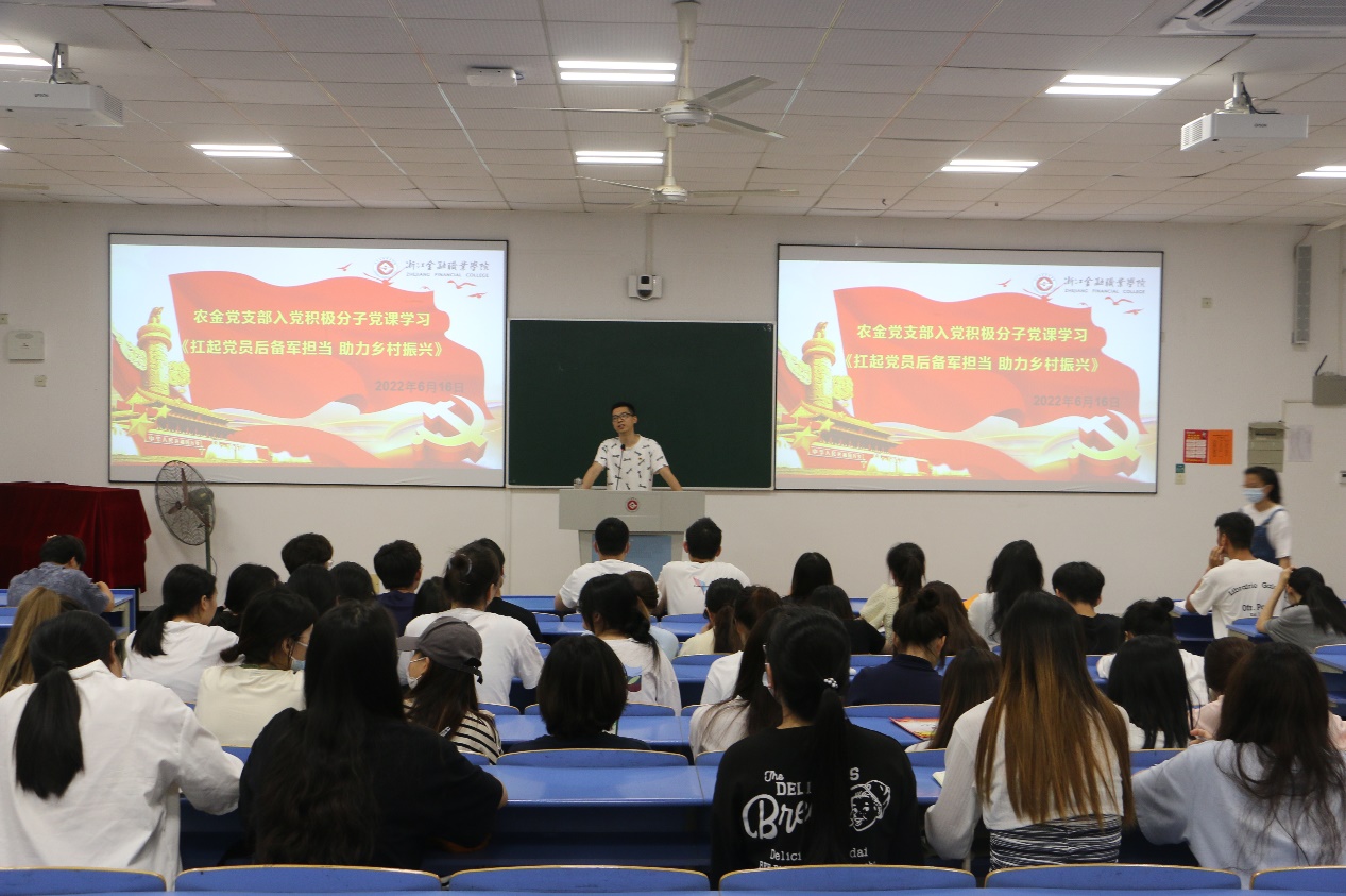 课上,俞滨从专业办学历程、农金专业发展方向以及入党积极分子的责任与担当三方面展开介绍。他强调入党积极分子需紧跟党组织步伐,永远跟党走,不断提高自身综合素质能力,争取成为一名合格的中国共产党员。随后,他围绕学校发展历程、往届校友工作岗位,结合专业发展、专业特点以及师资力量三个方面进行详细叙述,帮助入党积极分子了解专业办学历程,从整体上把握专业发展脉络。课上,他结合自身经历对农金专业学子的未来发展方向进行详细解读,在认知方面,他提醒入党积极分子摆正对农村经济发展地位的认识,重视城镇与农村之间的紧密关系,注重县城的发展潜力与发展空间。此外,针对未来不同的发展方向,分别提出了针对性的建议,希望各位入党积极分子认清自身优劣势,在大学学习过程中着重培养自己缜密的思维,锻炼自身逻辑性,学好相关专业知识以及了解相关的政策。