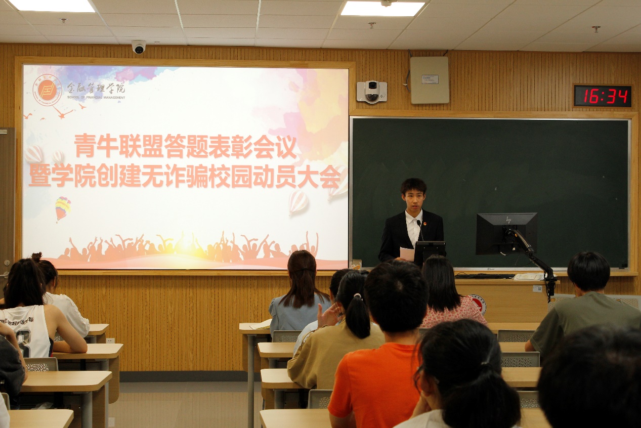 为增强学院同学防诈骗意识,持续开展安全教育活动,进一步营造平安校园环境,6月17日下午,金融管理学院举办青牛联盟表彰会议暨学院创建“无诈校园”阶段总结会,在泰隆110教室举行。出席本次表彰仪式的有金融管理学院辅导员姚跃跃、彭采婧以及学院各班反诈大使,金科212郭宇轩担任活动主持人。