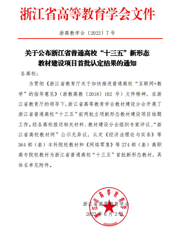 为贯彻《浙江省教育厅关于加快推进普通高校“互联网+教学”的指导意见》(浙教高教〔2018〕102 号)文件精神,在浙江省教育厅的领导下,浙江省高等教育学会教材建设分会开展了浙江省普通高校“十三五”前两批立项新形态教材建设项目结题工作。确定364 部(套)本科院校教材和274 部(套)高职高专院校教材为浙江省普通高校“十三五”首批新形态教材,我院3名教师编写教材入选浙江省普通高校“十三五”新形态教材建设项目首批认定,具体名单如下: