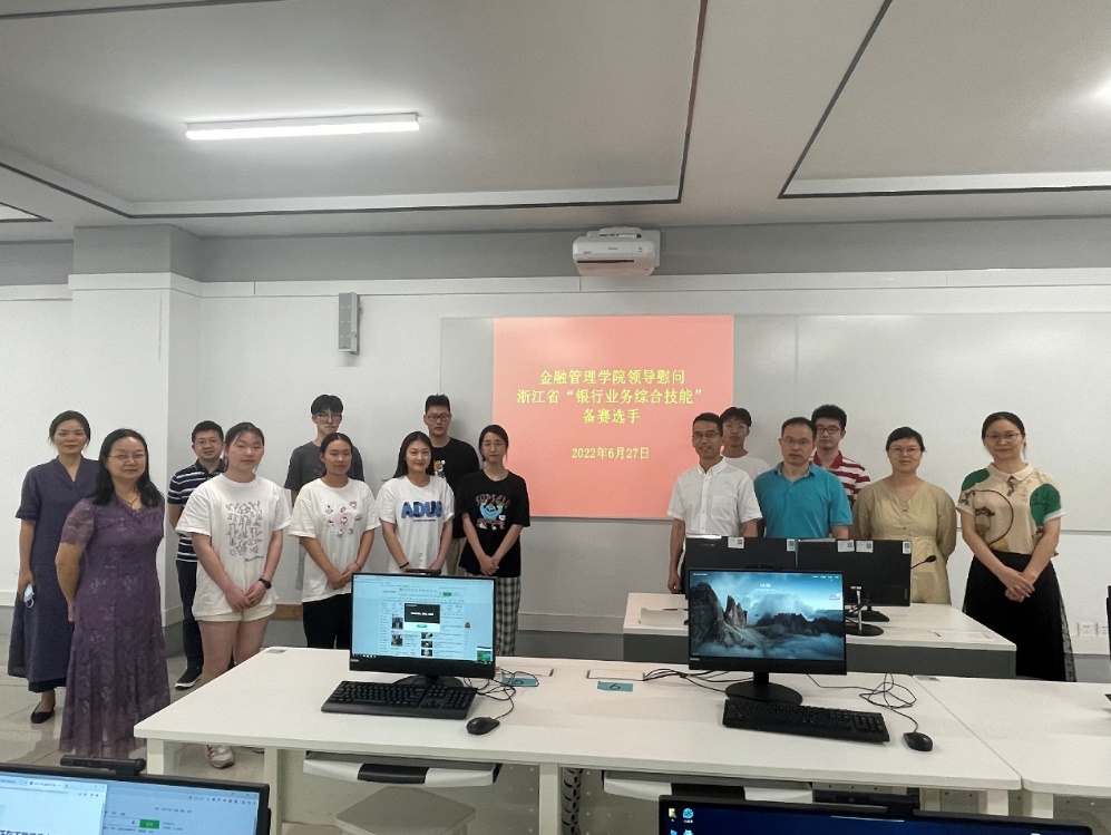 为鼓励参加银行业务综合技能省赛学生积极备赛,了解学子备赛情况,增强学生比赛动力,增进学生比赛信心。6月27日下午,金融管理学院院长董瑞丽,学院党总支书记、副院长钱利安,学院党总支副书记、副院长吴金旺,学院副院长凌海波,学院党总支副书记吴小燕,以及学院学工办教师前往金通201教室走访慰问备赛浙江省高职院校银行业务综合技能大赛的学子们。