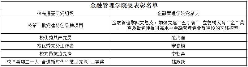近期以来,金融管理学院党总支努力加强自身建设、党员队伍素质建设,全面夯实党建基础,加强党员理论学习,切实筑牢党员干部理想信念,取得一系列成果,并在此次大会上受到表彰。具体表彰内容如下: