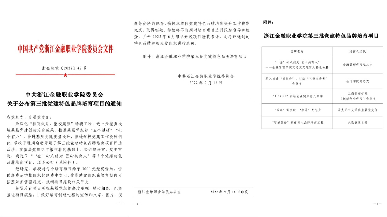 为深化“抓院促系、整校建强”铸魂工程,进一步挖掘提炼基层党建创新培育成果,推进基层党组织“五个过硬”“七个有力”,推进基层党建质量提升,推进学校党建工作提质创优,学校于近期开展第三批党建特色品牌培育项目评选活动,在基层党组织申报推荐的基础上,经组织评审,学校党委审定,金融管理学院党总支“‘金’心八结对 匠心共育人”党建育人特色品牌入选学校第三批批党建特色品牌培育项目。