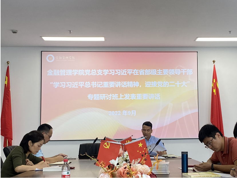 9月21日下午,金融管理学院党总支在泰隆718会议室召开学习会议,深入学习习近平总书记在省部级主要领导干部“学习习近平总书记重要讲话精神,迎接党的二十大”专题研讨班上的重要讲话精神。金融管理学院党总支书记钱利安主持学习会,带领大家共同学习探讨,金融管理学院党总支理论学习中心组成员参与学习。